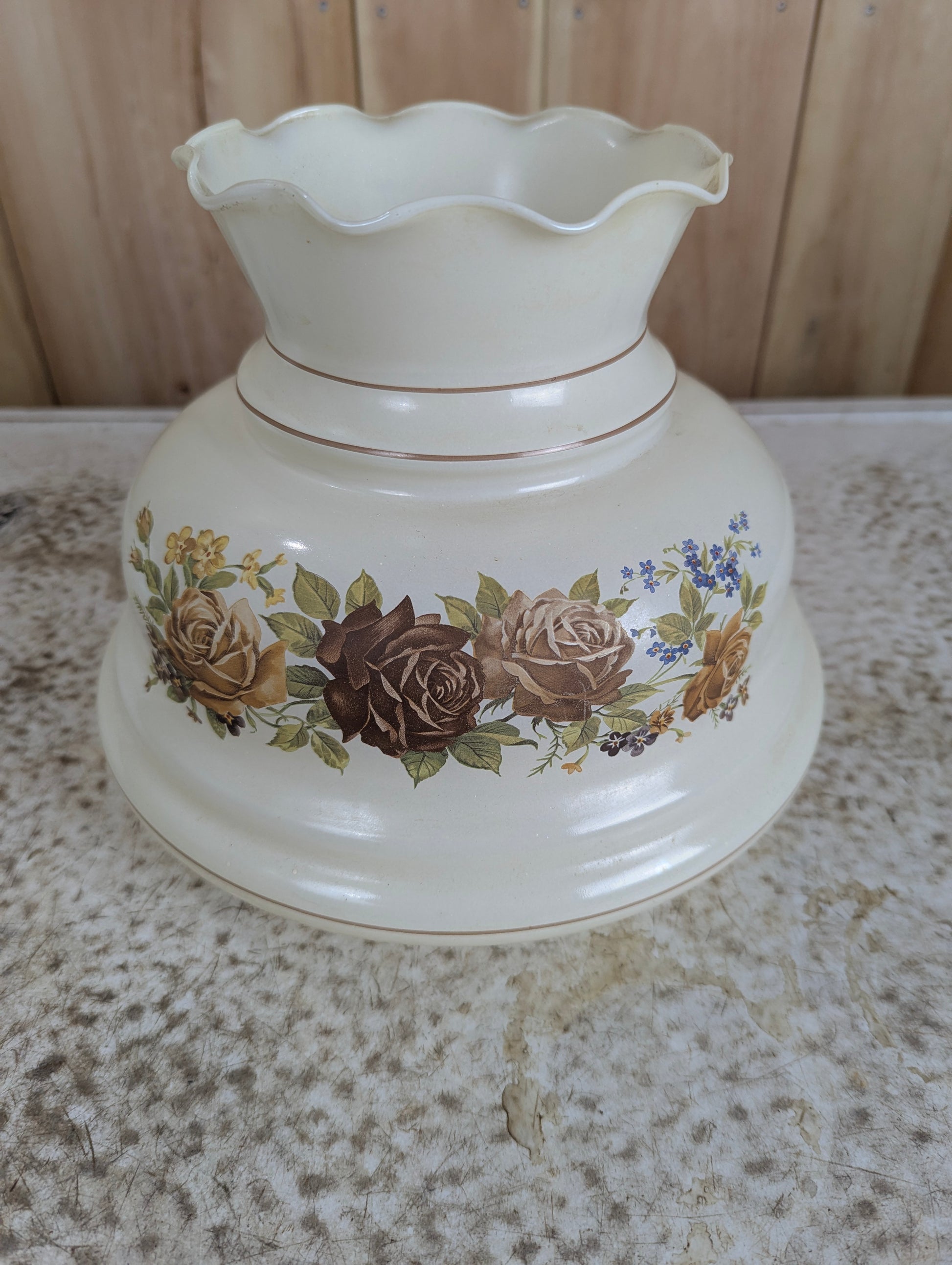 This charming 7” floral milk glass lamp shade adds a touch of vintage elegance to any room. Its delicate floral pattern complements classic and contemporary decor alike. While it shows gentle signs of use with a small chip on the top rim, its overall condition remains good, making it a unique and affordable statement piece to brighten your home.