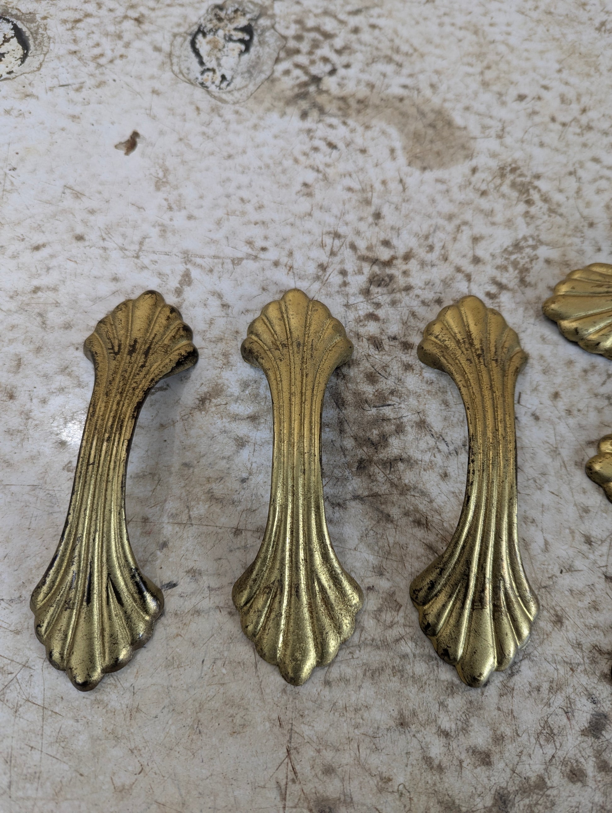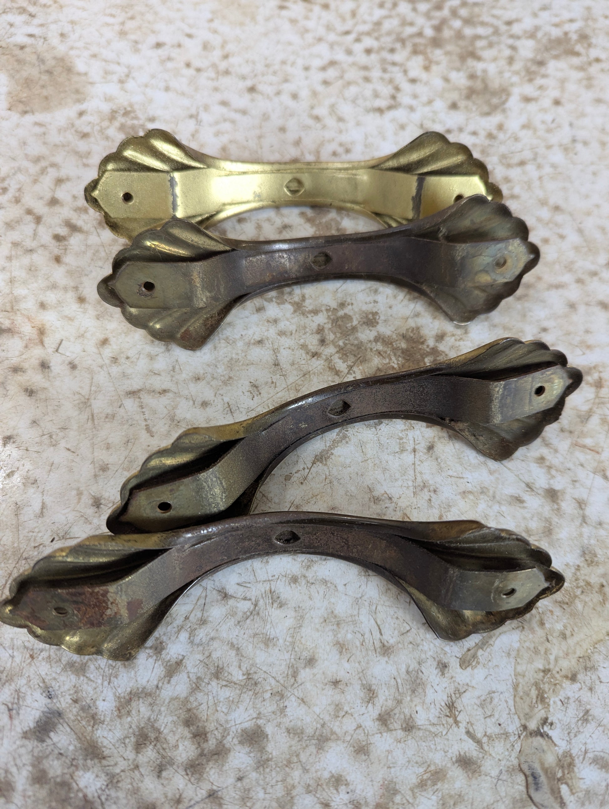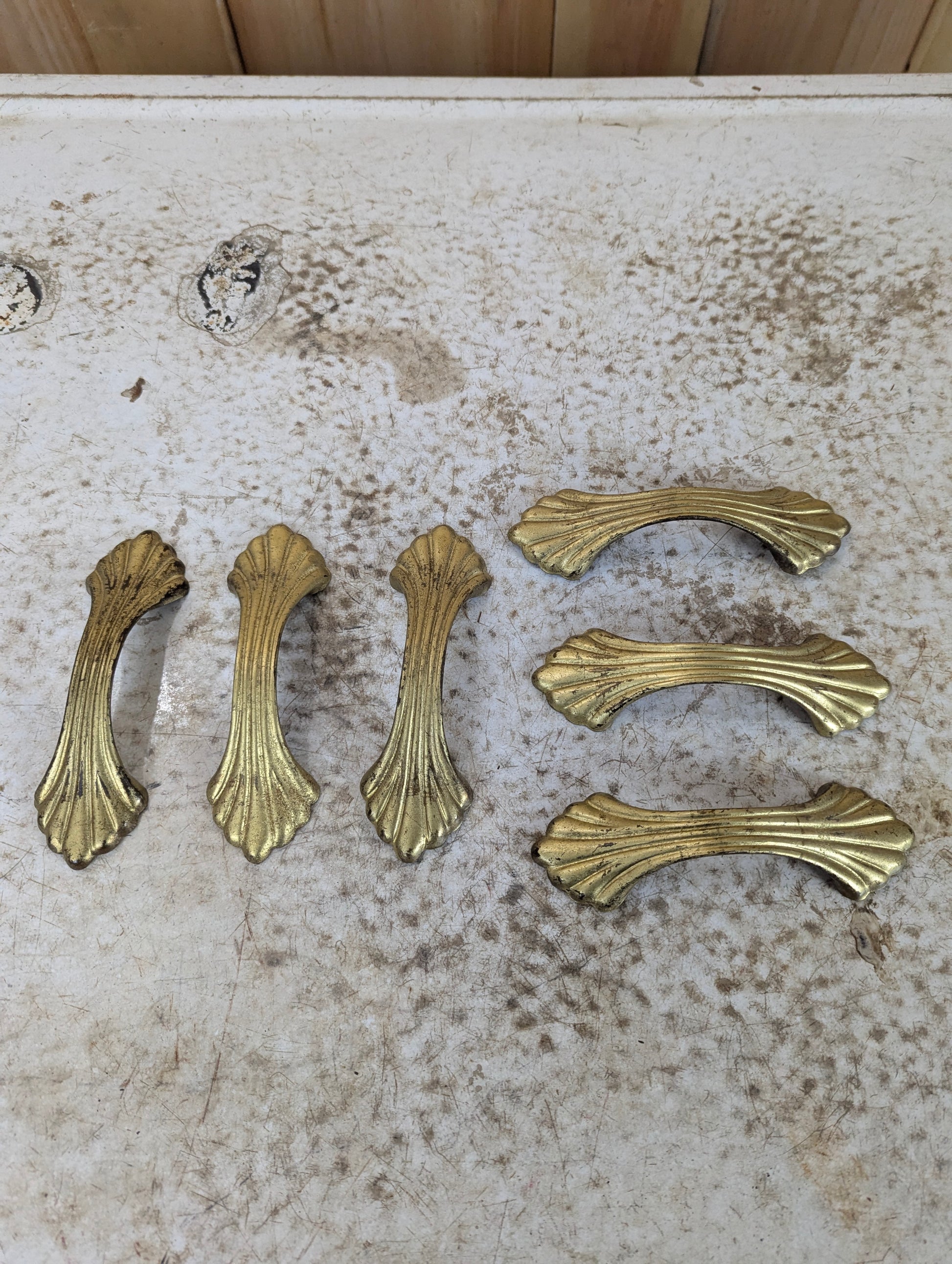 Enhance the charm of your furniture with these Vintage Art Deco Brass Drawer Pulls. This set of 6 features scalloped ends for a touch of elegance. Crafted from high-quality brass, these pulls are not only beautiful but also durable. Elevate the style of any room with these stunning drawer pulls!