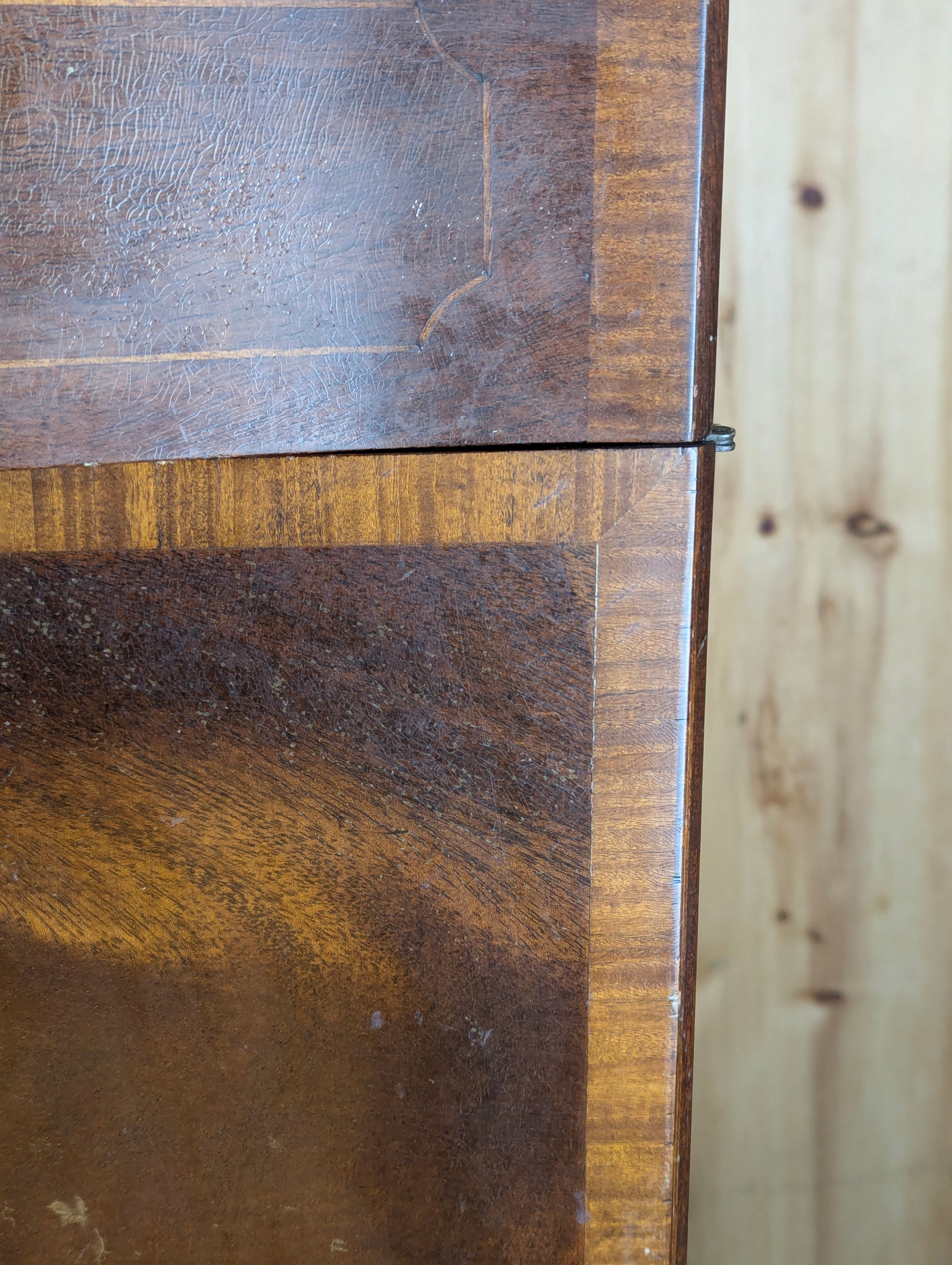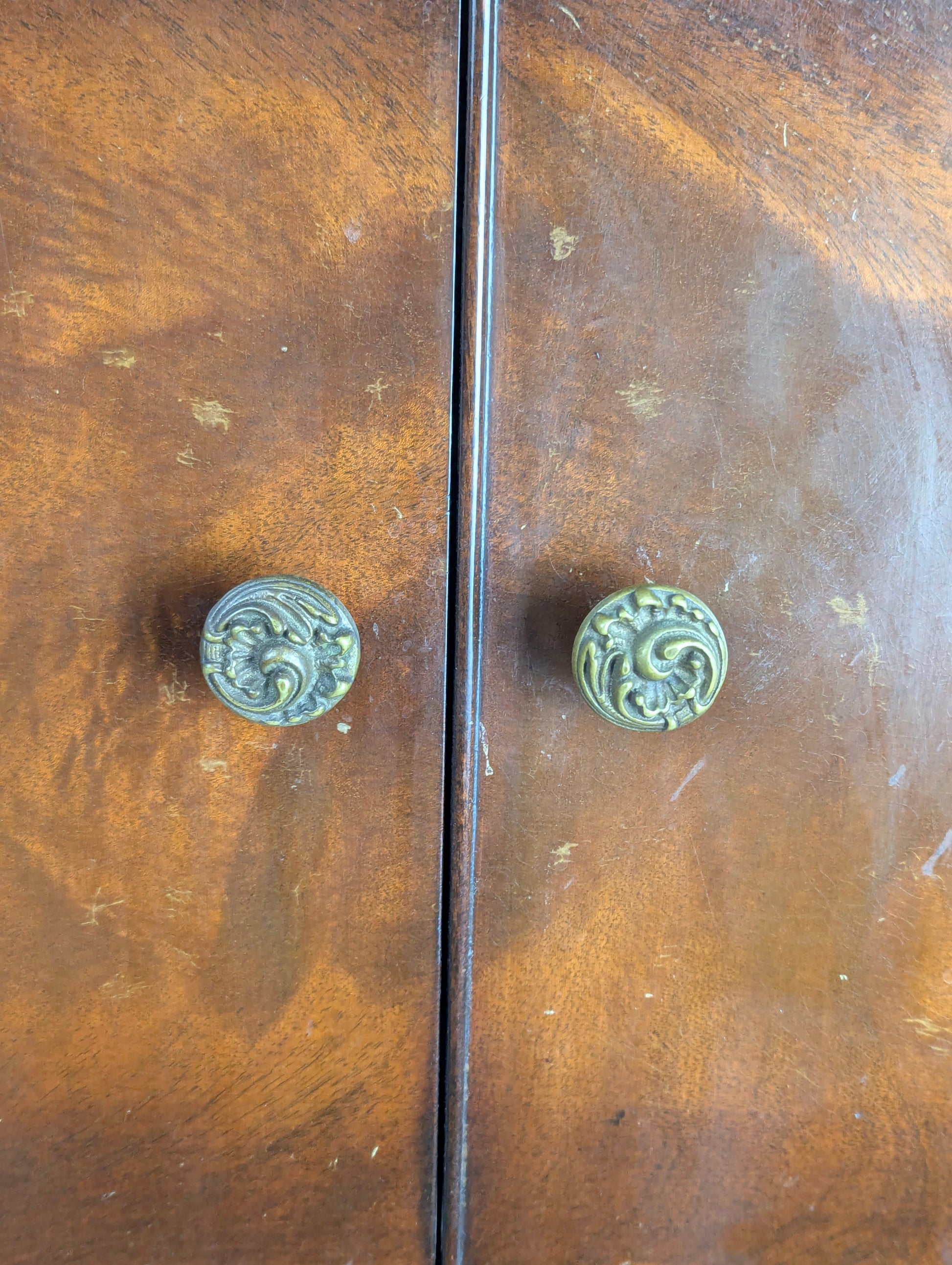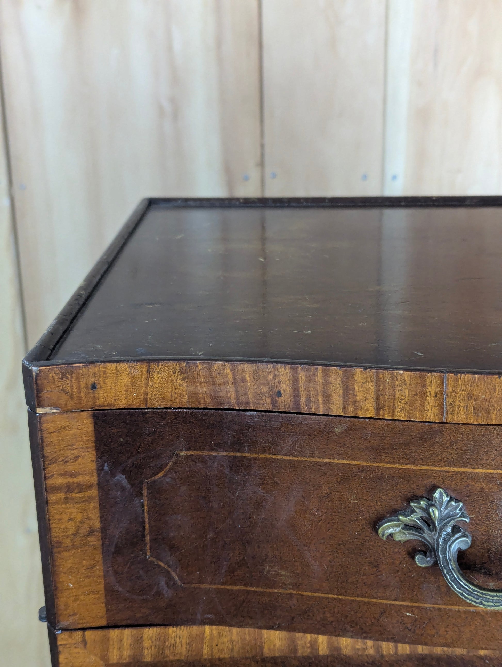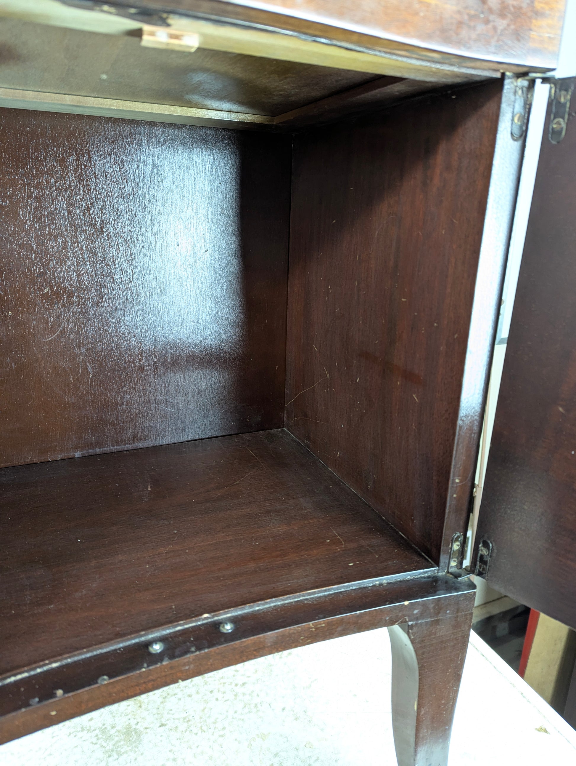 Vintage Art Deco End Table with timeless appeal and practical functionality. This well-loved piece measures 17" x 13.5" x 29" and features original brass hardware that adds authentic character. The curved-front drawer with oak interior and two spacious storage doors make it ideal for bedside use or living room display. A protective lip along the top prevents items from shifting. Shows honest signs of wear consistent with its age, adding to its vintage charm and authenticity.