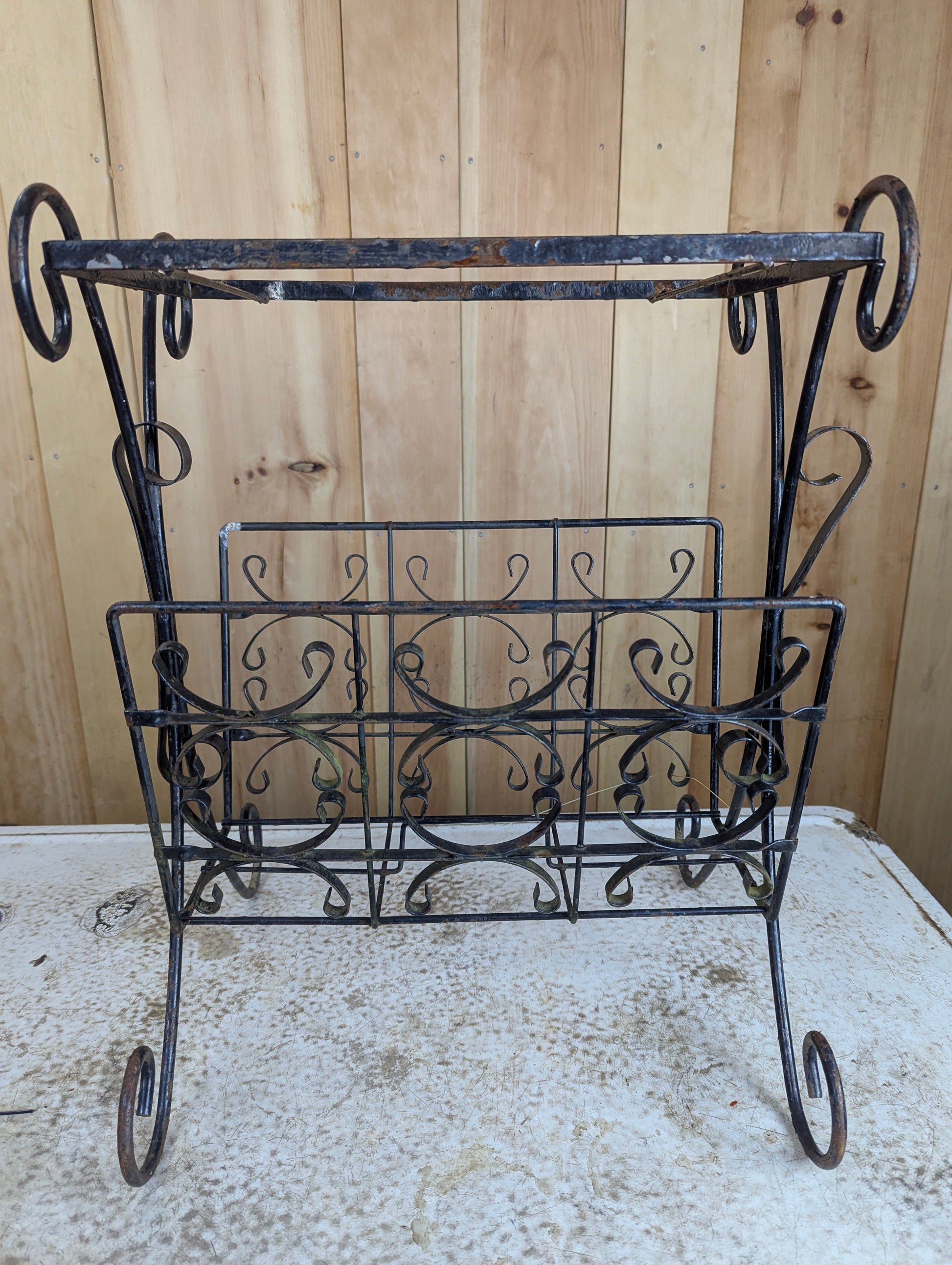 This vintage black wrought iron side table stands 20” high and measures 15” long, offering ample storage space at the bottom perfect for holding magazines. Its sturdy design and timeless style add both functionality and charm to any room, making it an ideal piece for organizing your reading materials while enhancing your décor. Comes without a top.
