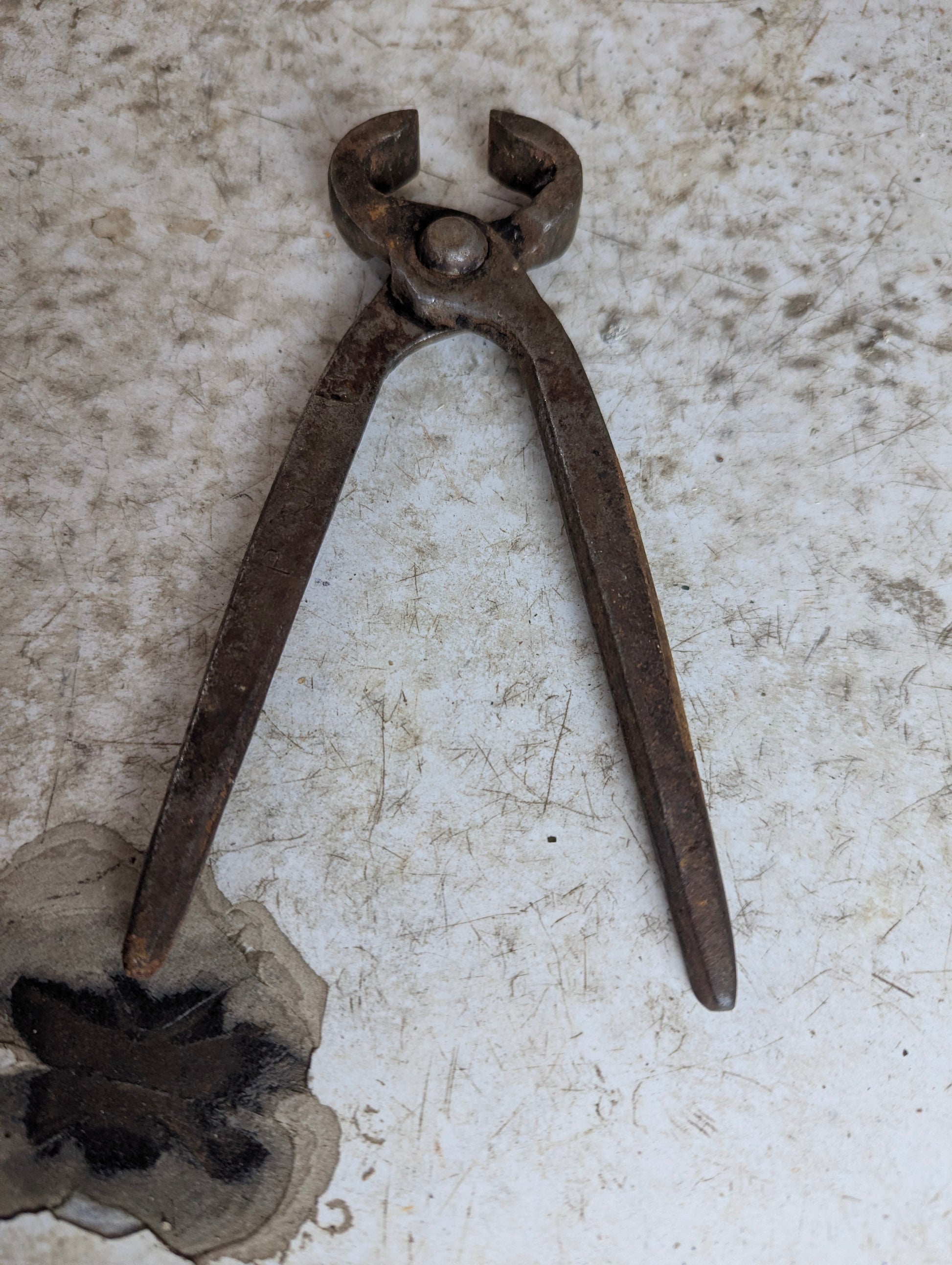 Authentic vintage blacksmith metal nipper pliers crafted for serious metalworkers and tool collectors. This well-used 6.5" tool bears the honest patina of years spent in the forge, with visible wear that speaks to its durability and proven performance. The sturdy metal construction delivers reliable gripping power for cutting, bending, and shaping metal stock. Perfect for restoration projects, blacksmithing enthusiasts, or anyone seeking genuine vintage workshop equipment with character and functionality. A piece of working history that's ready for its next chapter.