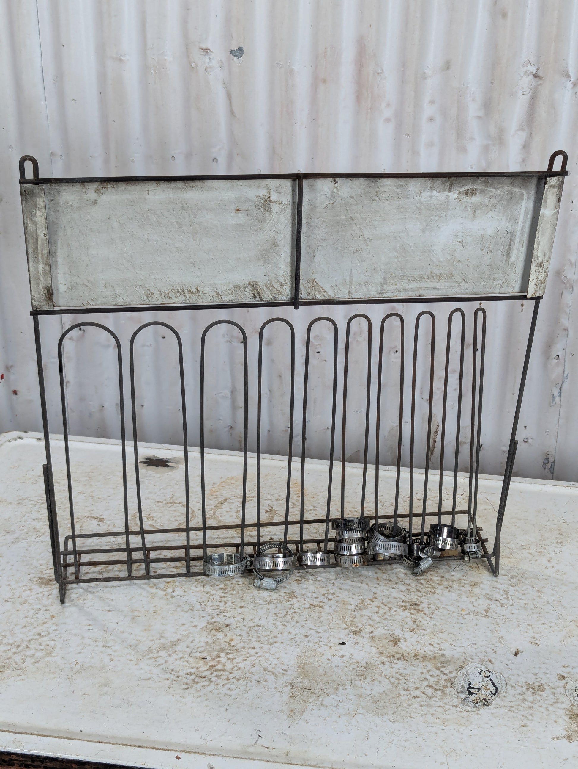 This Vintage Bowes Automotive Products Clamp Display Rack is a practical and collectible addition to your workshop or garage. Measuring 20” x 20” with a 5” diameter bottom wire shelf, it offers sturdy storage for clamps and tools. While it shows signs of wear, its fair condition adds authentic character, making it a unique piece for enthusiasts and professionals alike. Organize your workspace efficiently with this classic clamp rack.