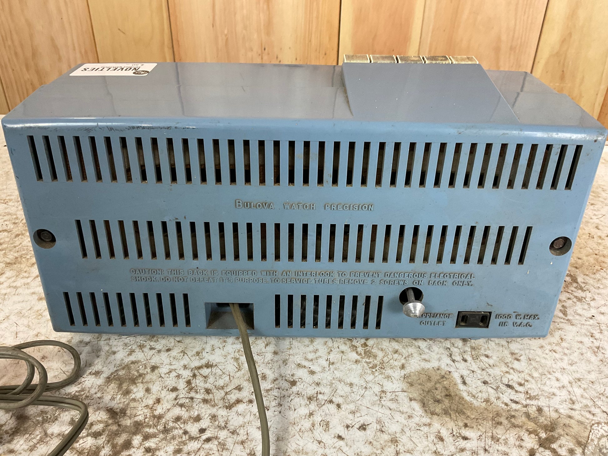 This Vintage Bulova Clock Radio Model 190 Series, crafted in Toronto by Bulova Watch Co Ltd, combines classic design with reliable function. It is in good condition and fully operational, featuring a convenient appliance outlet on the back. The power cord is intact and well-maintained, ensuring safe and easy use. Add a touch of timeless style and dependable performance to your space with this authentic Bulova clock radio.