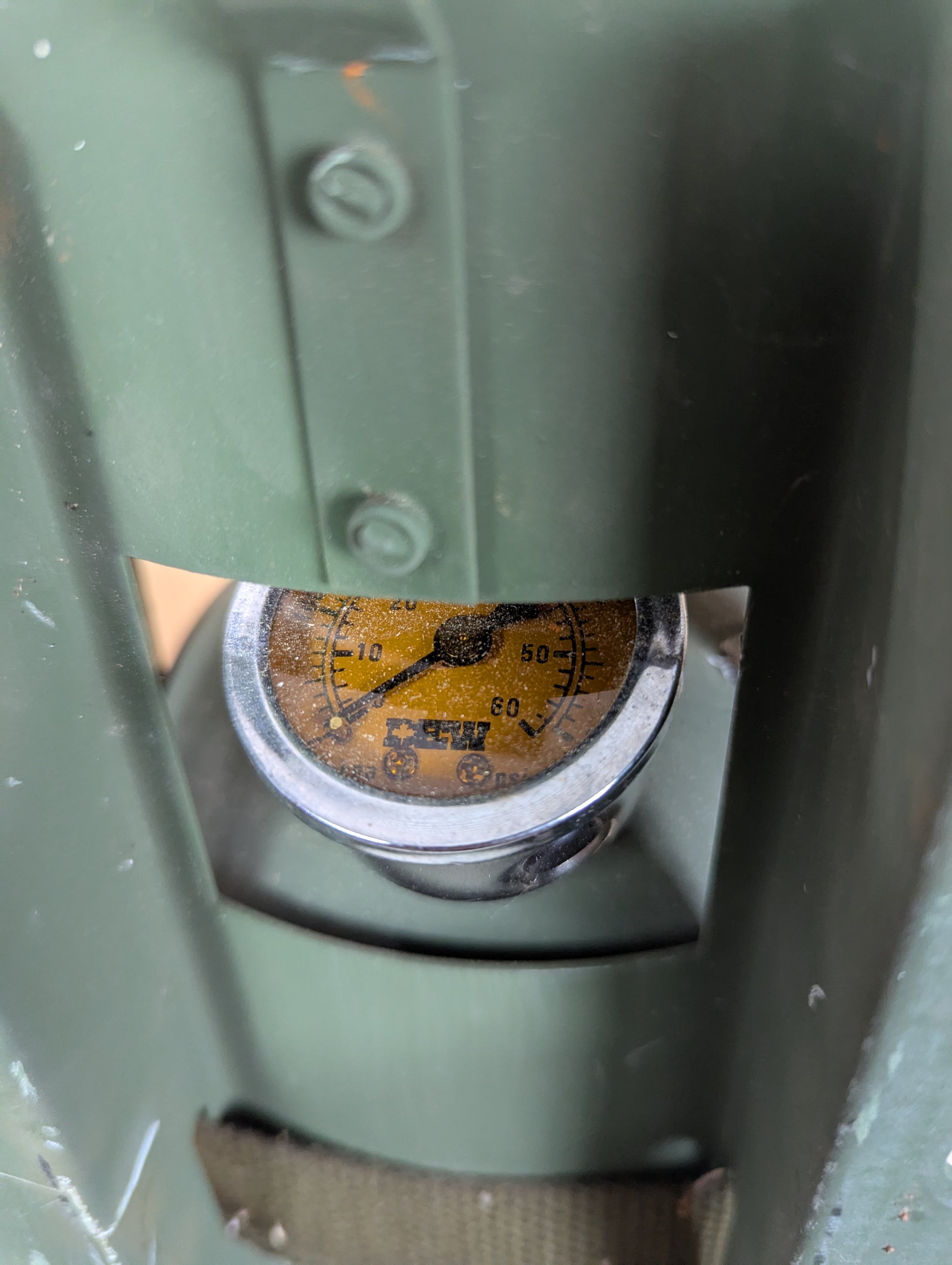 This vintage Canadian military decontamination apparatus is a rare collectible in very good used condition. Originally utilized by the military, it features a sturdy mounting bracket for secure installation. A unique piece for collectors and enthusiasts, it offers both historical value and authentic military craftsmanship.