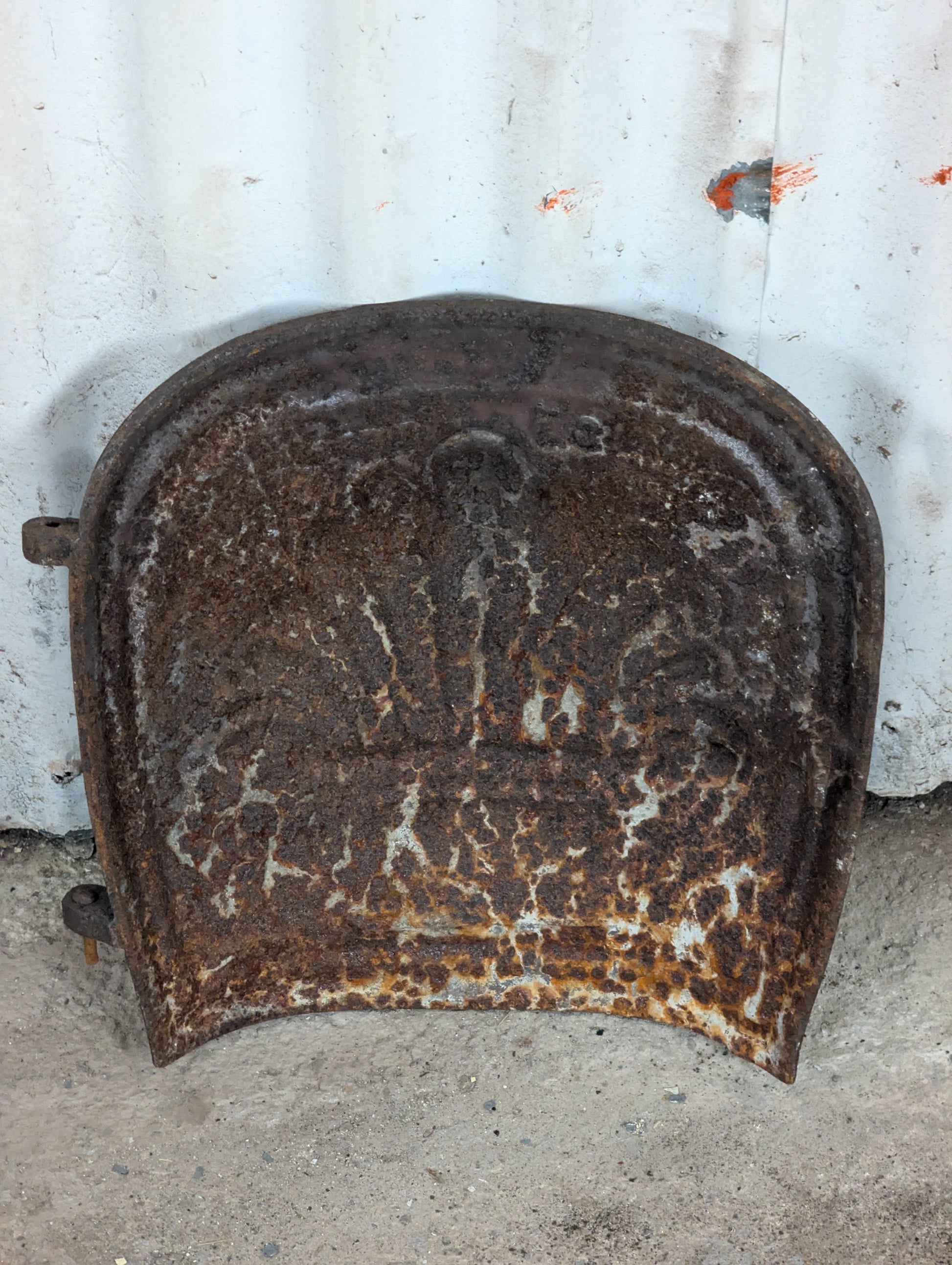 This vintage cast iron “Fulton” stove door, patented in 1860, is in good condition with unique embossed design. Measuring 13” x 12”, its heavy, durable construction makes it perfect for a DIY project or as a distinctive piece of wall art. Add a touch of history and character to your space with this unique collectible.