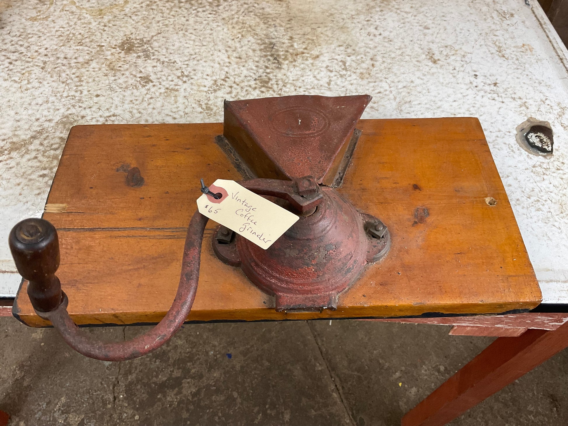 This vintage cast iron hand cranked coffee grinder, mounted on a sturdy wooden board measuring 16” x 8” with a depth of 1.75”, is a charming and functional addition to any coffee bar. In good condition, it combines classic craftsmanship with practical use, allowing you to grind fresh coffee beans with ease while adding a nostalgic touch to your space. Perfect for coffee enthusiasts who appreciate both style and quality.