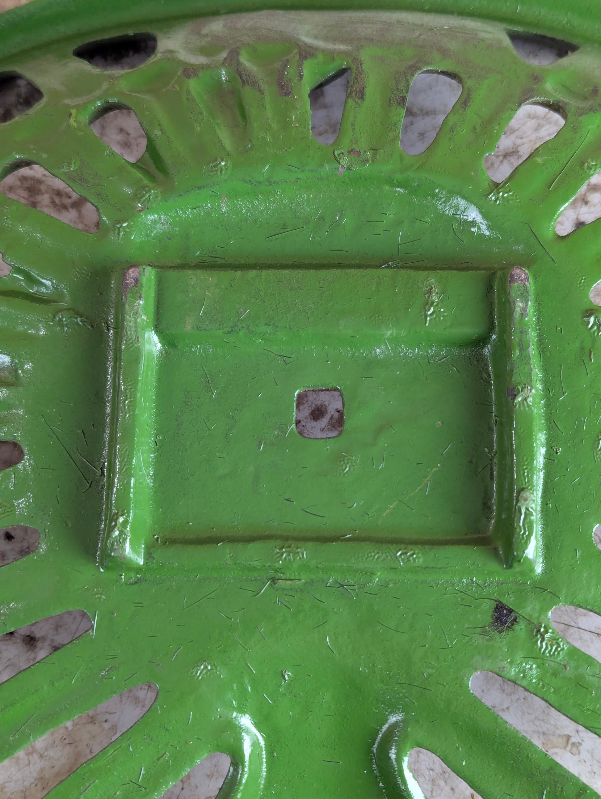 Vintage Cast Iron John Deere "1847" Tractor Seat in good used condition. This heavy cast iron piece measures 17.5" wide and 12.5" deep, making it a substantial addition to any collection or DIY project. Perfect for restoration enthusiasts, industrial décor, or functional seating projects. Authentic vintage farm equipment with character and patina.