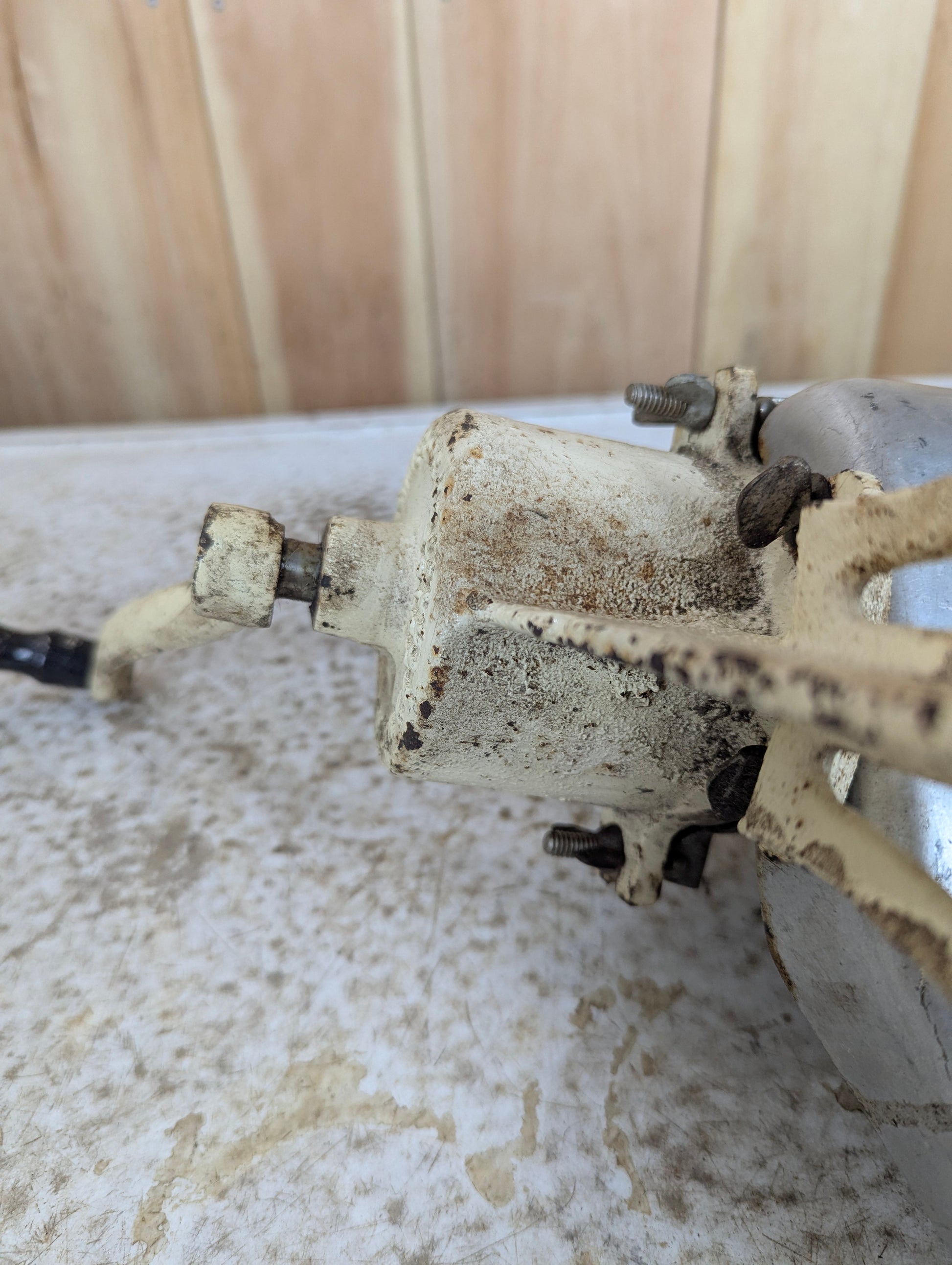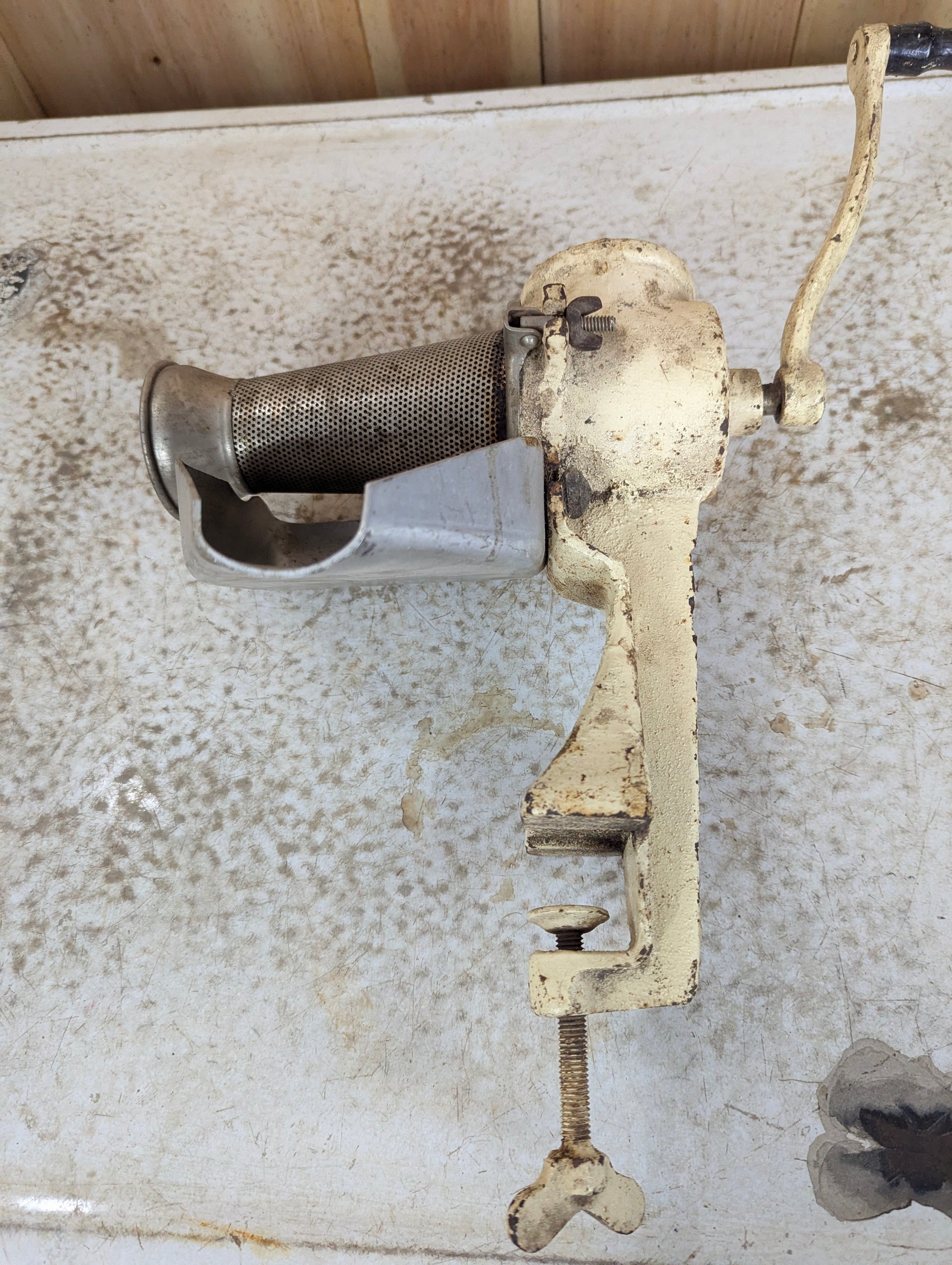 This vintage cast iron juice extractor from Victory Tool & Machine Co. combines durability with classic manual operation. Crafted with sturdy cast iron and aluminum juicer elements, it offers reliable performance for fresh juice extraction. Though the hopper is missing, its hand-cranked design mounts securely to a table or counter, making it perfect for those who appreciate authentic, hands-on juicing. A charming addition for collectors or practical users seeking a timeless juicer with character.