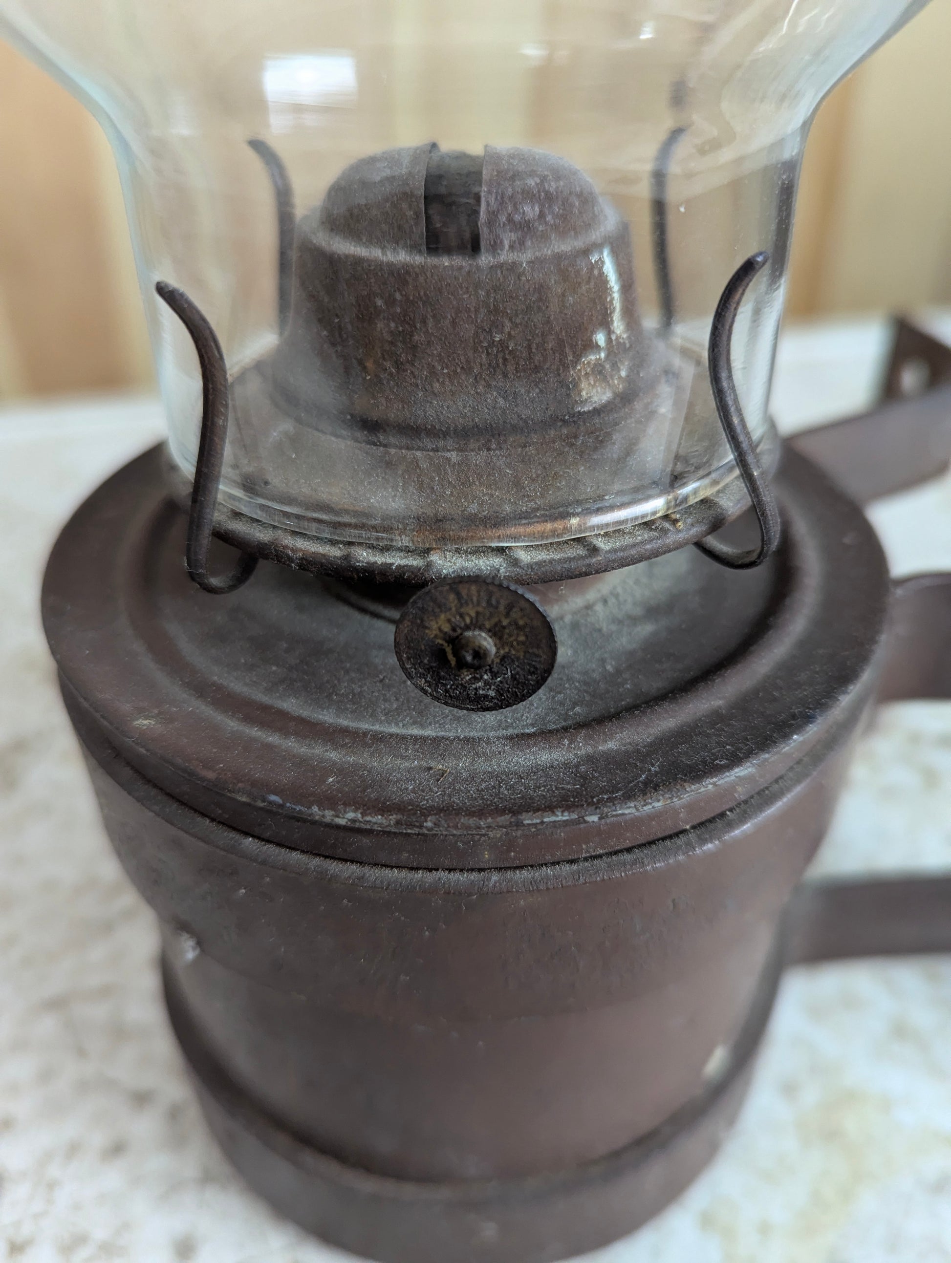 This Vintage CN Wall Mounted Oil Lamp is a charming collectible that adds rustic character to any space. In good used condition, it features a sturdy bracket for easy mounting and an intact glass globe, ready to illuminate your decor with nostalgic warmth. Perfect for those who appreciate timeless vintage accents.