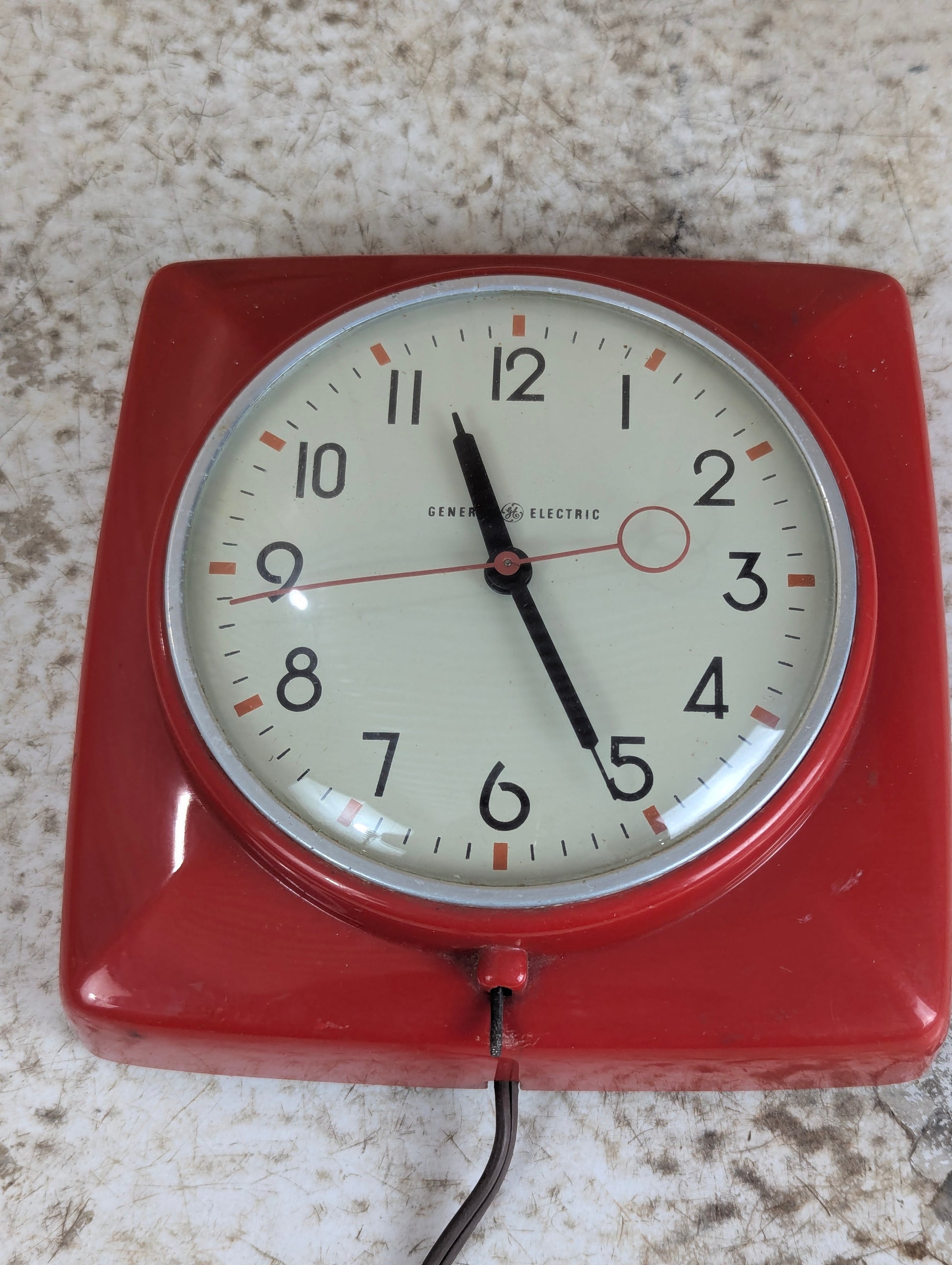 This Vintage General Electric Wall Clock Model 2QM2, dating from the late 1940s to early 1950s, is a charming addition to any vintage decor. Measuring 7” square with a 5” clock face, it features a durable plastic body and a clear glass face free of cracks. Fully functional and in good condition, this classic timepiece combines nostalgic style with reliable performance, making it a standout piece for collectors and enthusiasts alike.