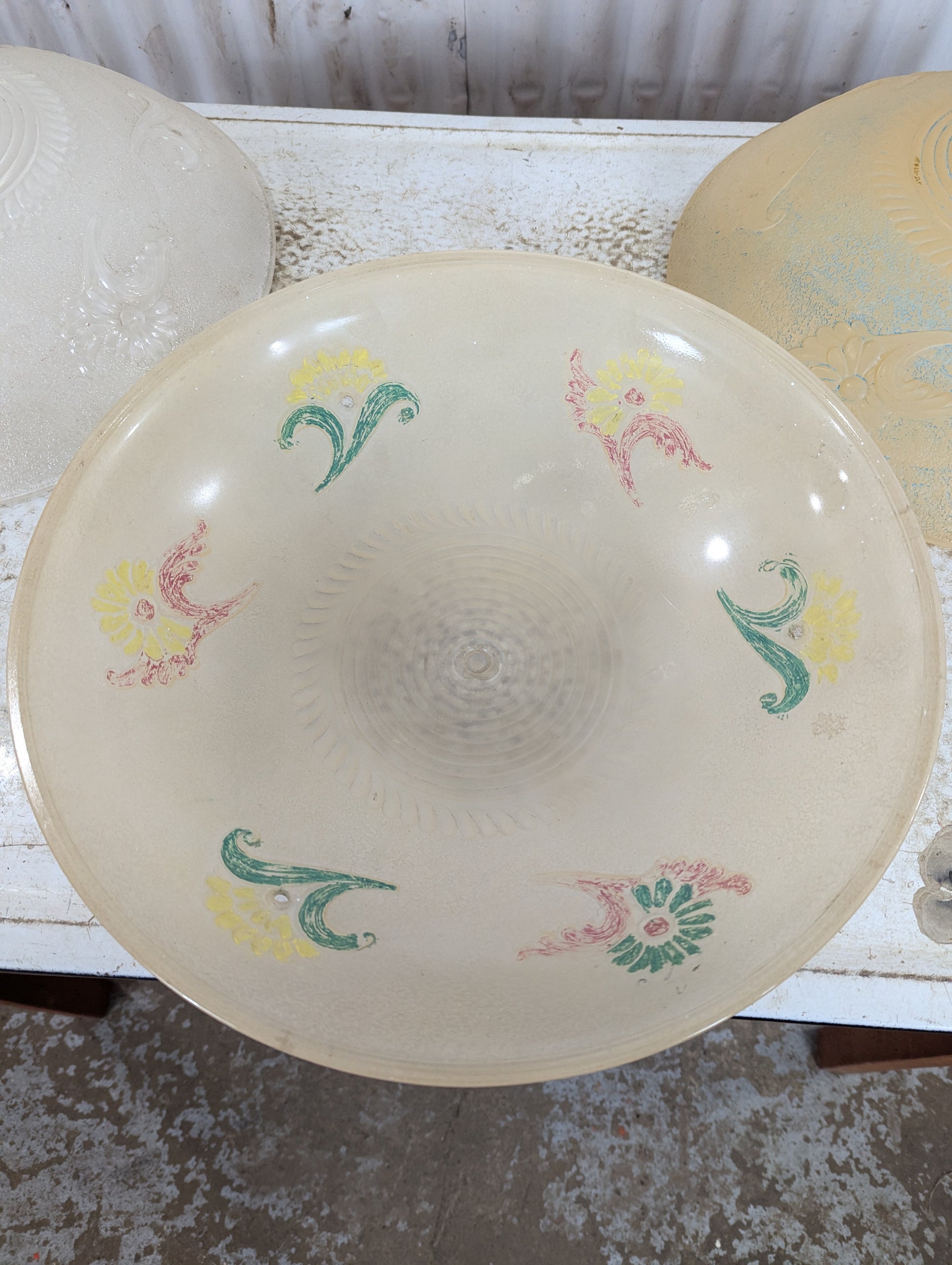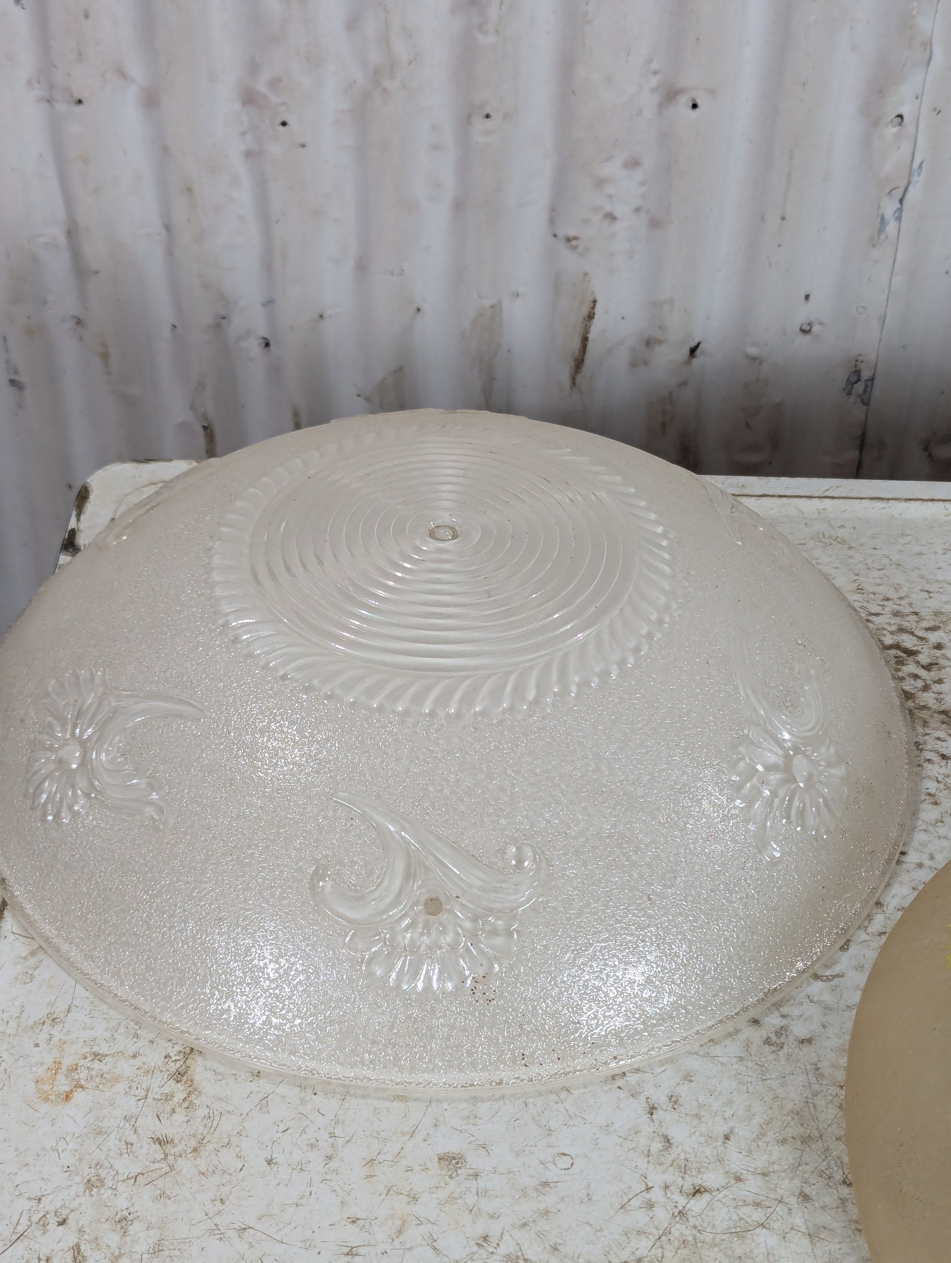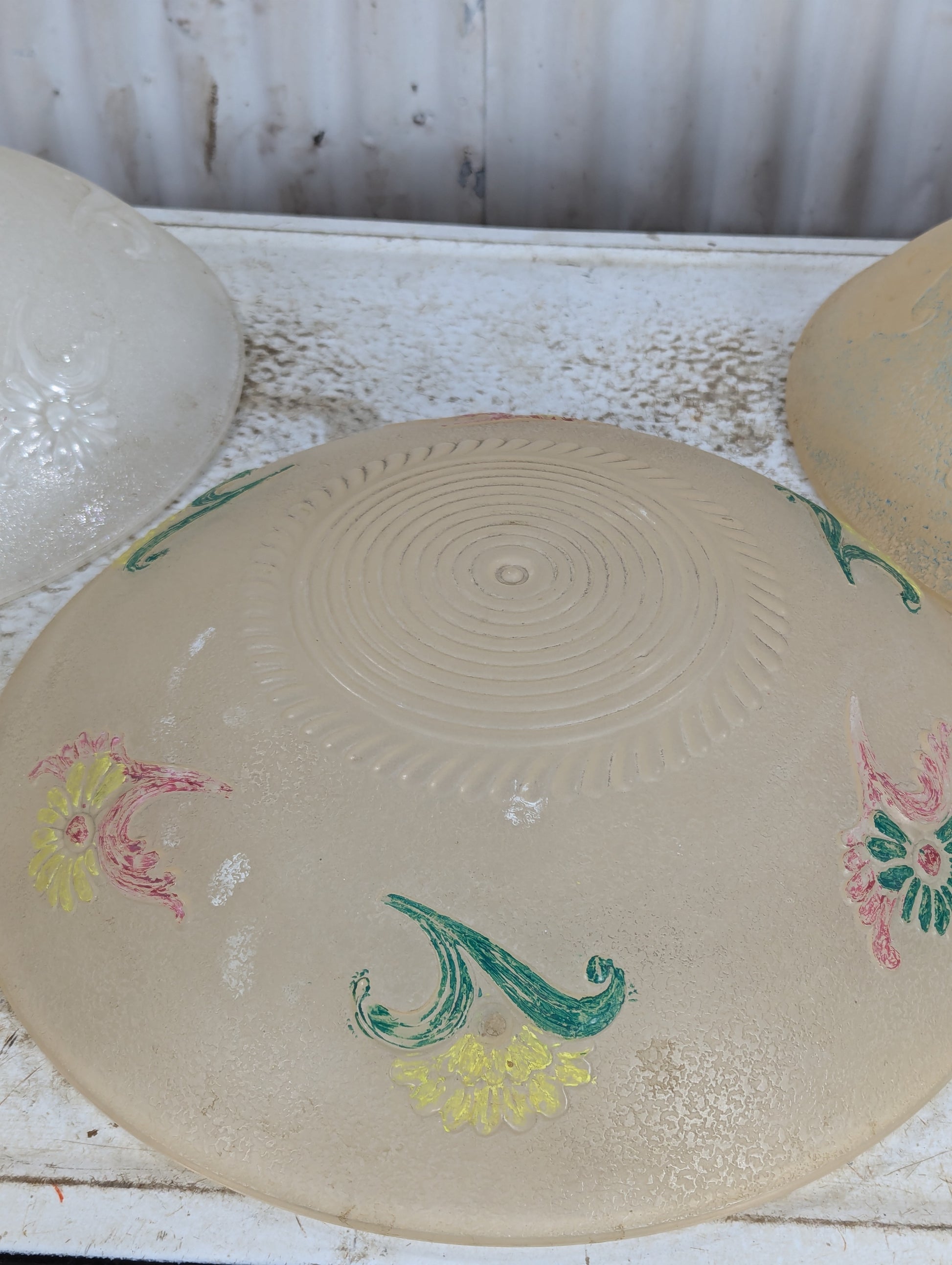 These vintage glass domer light shades, each measuring 16” in diameter, bring timeless charm to any space. Two of the shades have been painted, adding unique character and style. In good condition, they offer a perfect blend of classic design and subtle artistry, ideal for enhancing your lighting fixtures with a touch of vintage elegance. Priced at $20 each!