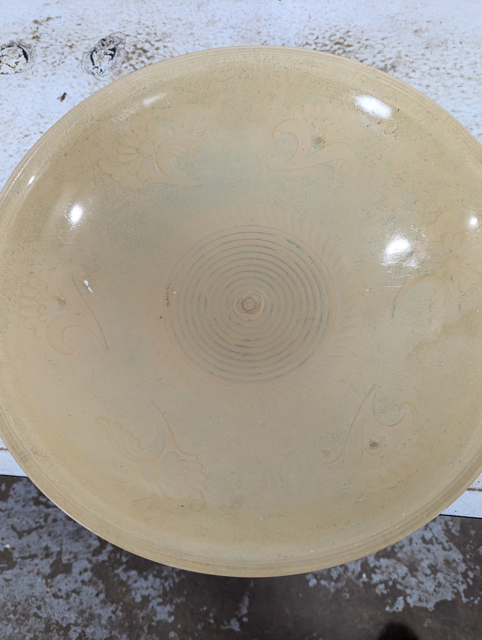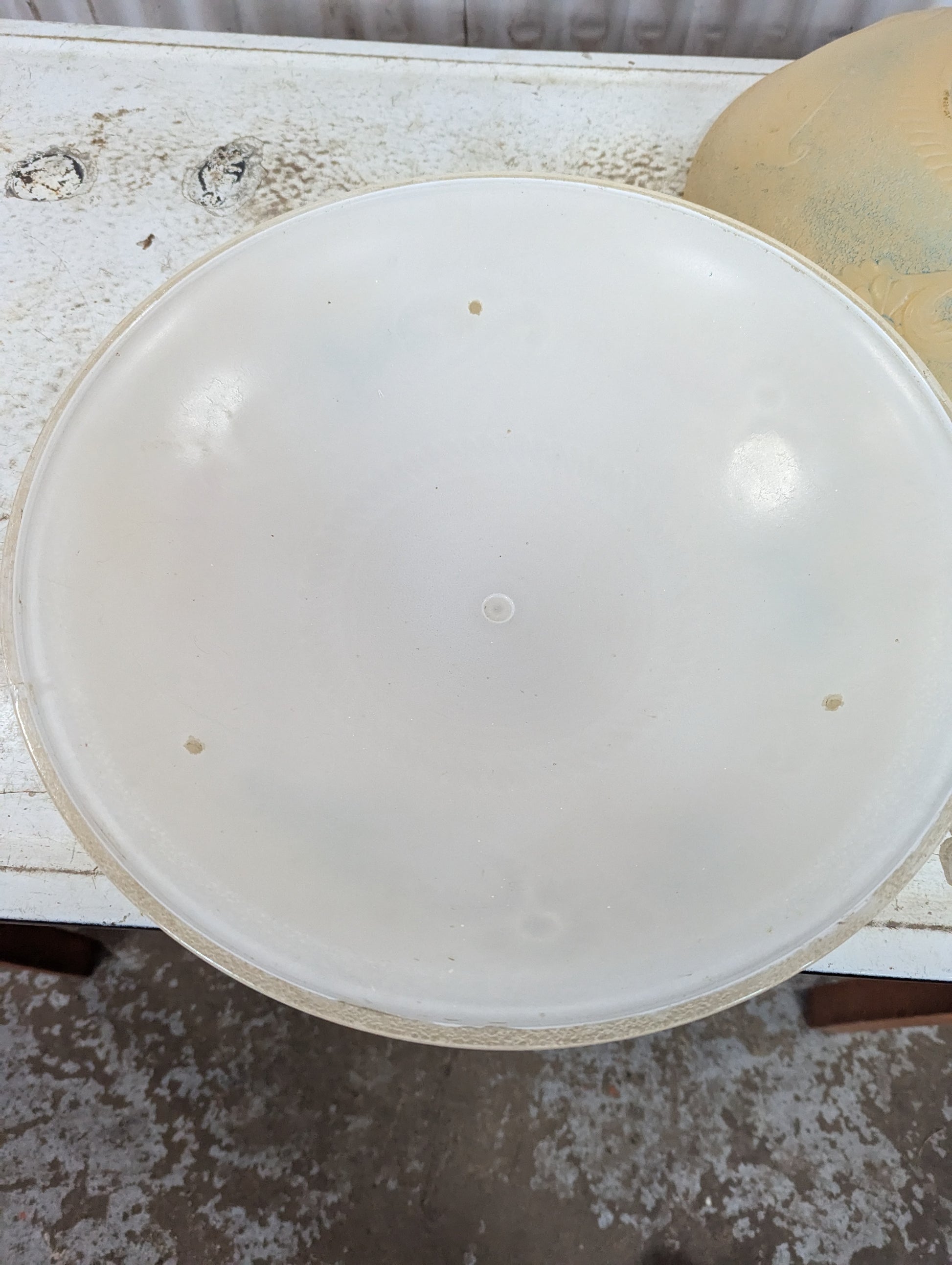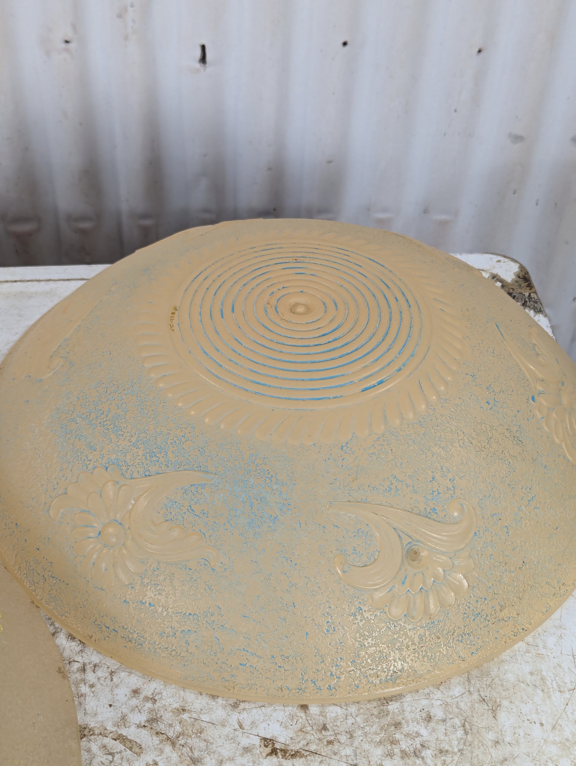 These vintage glass domer light shades, each measuring 16” in diameter, bring timeless charm to any space. Two of the shades have been painted, adding unique character and style. In good condition, they offer a perfect blend of classic design and subtle artistry, ideal for enhancing your lighting fixtures with a touch of vintage elegance. Priced at $20 each!