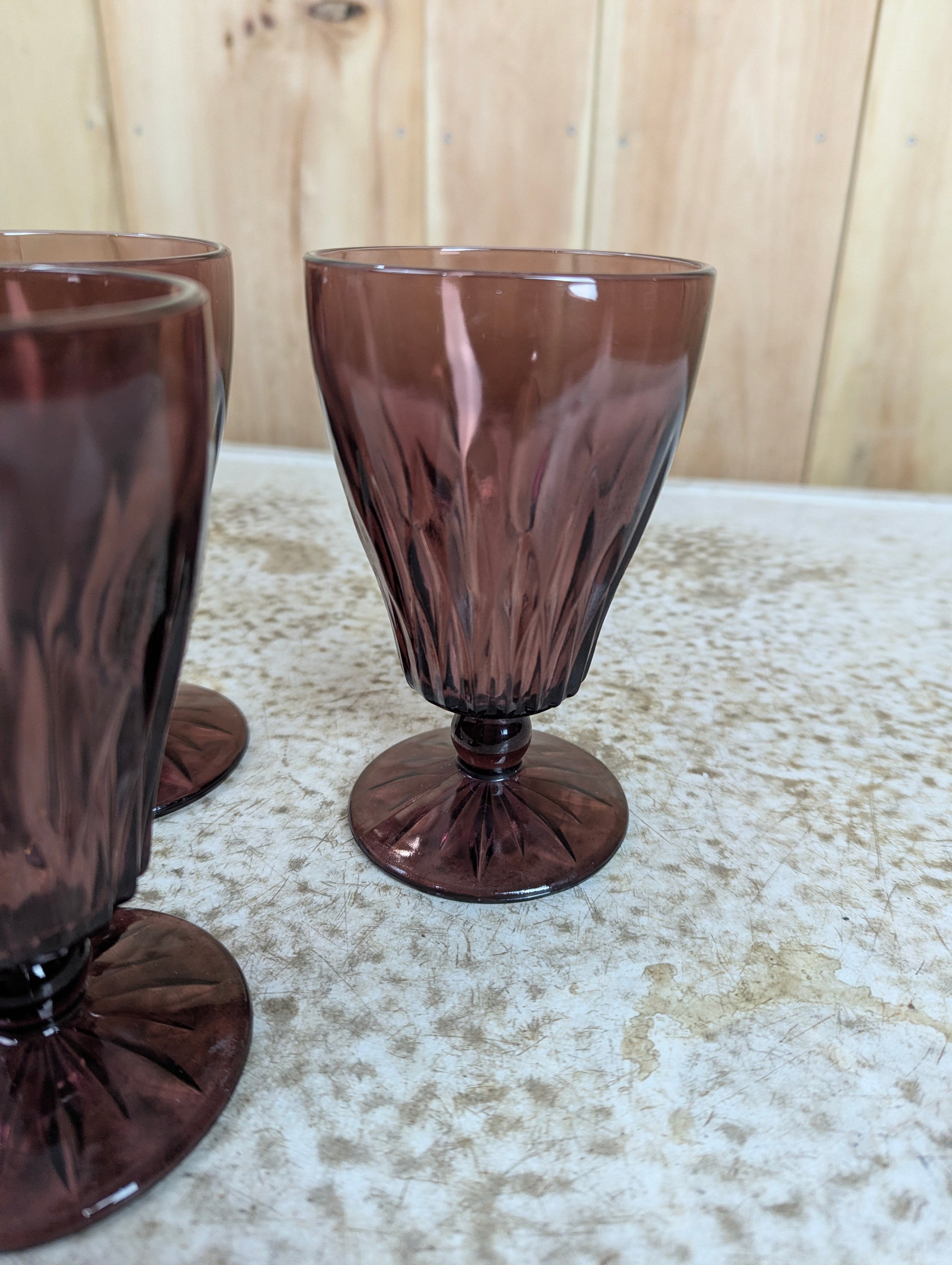 Elevate your vintage glassware collection with these stunning Hazel Atlas Moroccan Amethyst footed goblets from the 1940s-60s era. Each piece stands 5.5" tall with a 3.25" diameter, showcasing the distinctive amethyst hue that defined mid-century glassware design. In excellent condition, these goblets are perfect for display or entertaining, capturing the elegance and craftsmanship of a bygone era. A timeless treasure for serious collectors seeking authentic vintage pieces with character and charm.