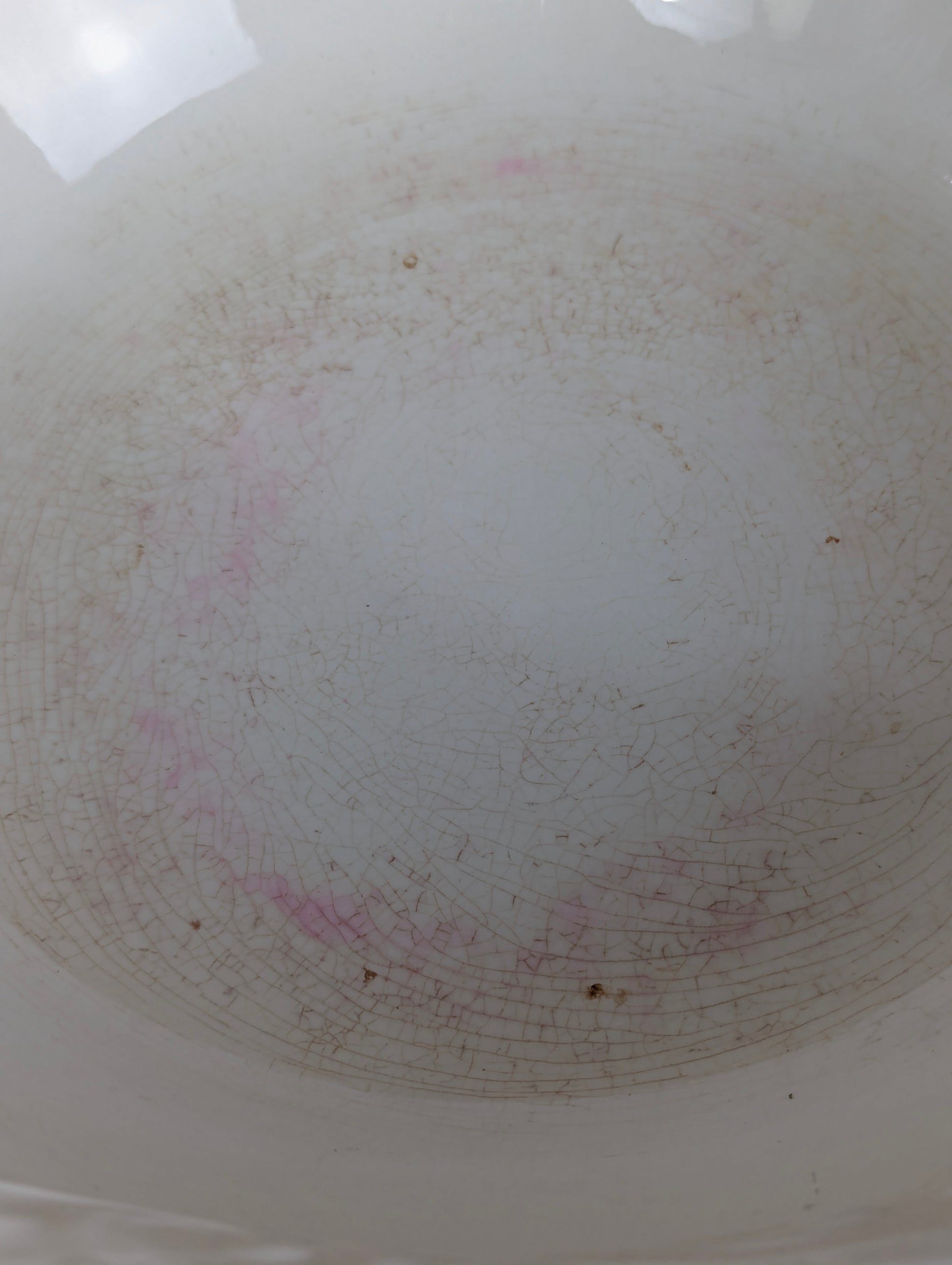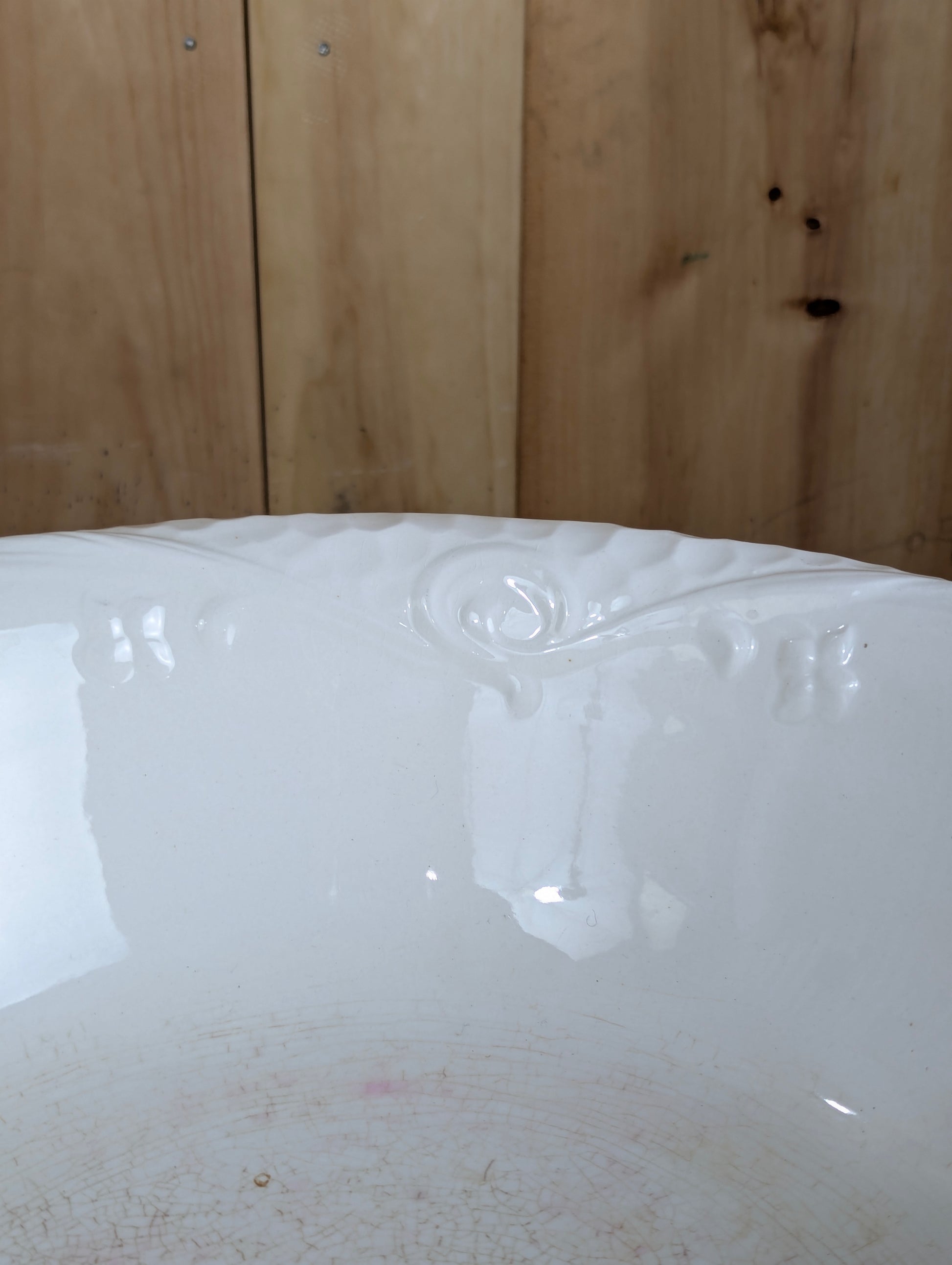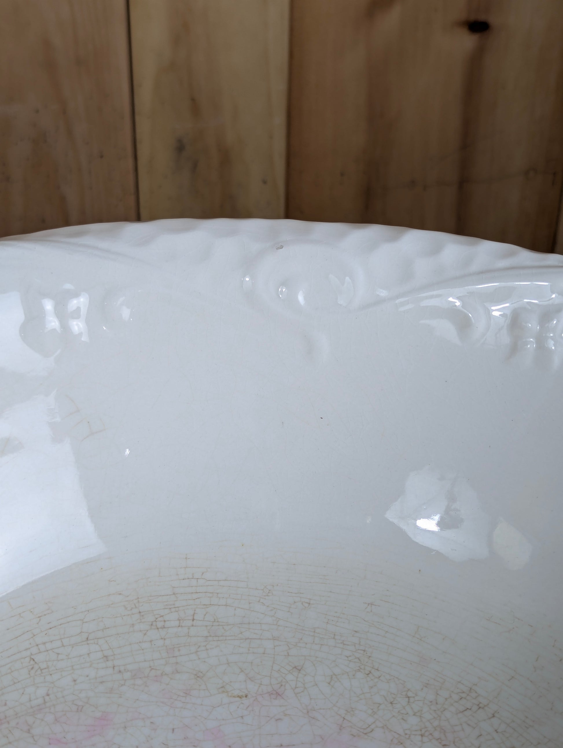 This Vintage J&G Meakin England Ironstone Washstand Bowl adds classic charm to your home decor. Measuring 5” high and 17” in diameter, it’s a substantial piece perfect for display or practical use. While it shows some discoloration and crackling inside and on the bottom, these details reflect its authentic vintage character, making it a unique addition to any collection. Enhance your space with timeless style and history captured in this elegant ironstone bowl.