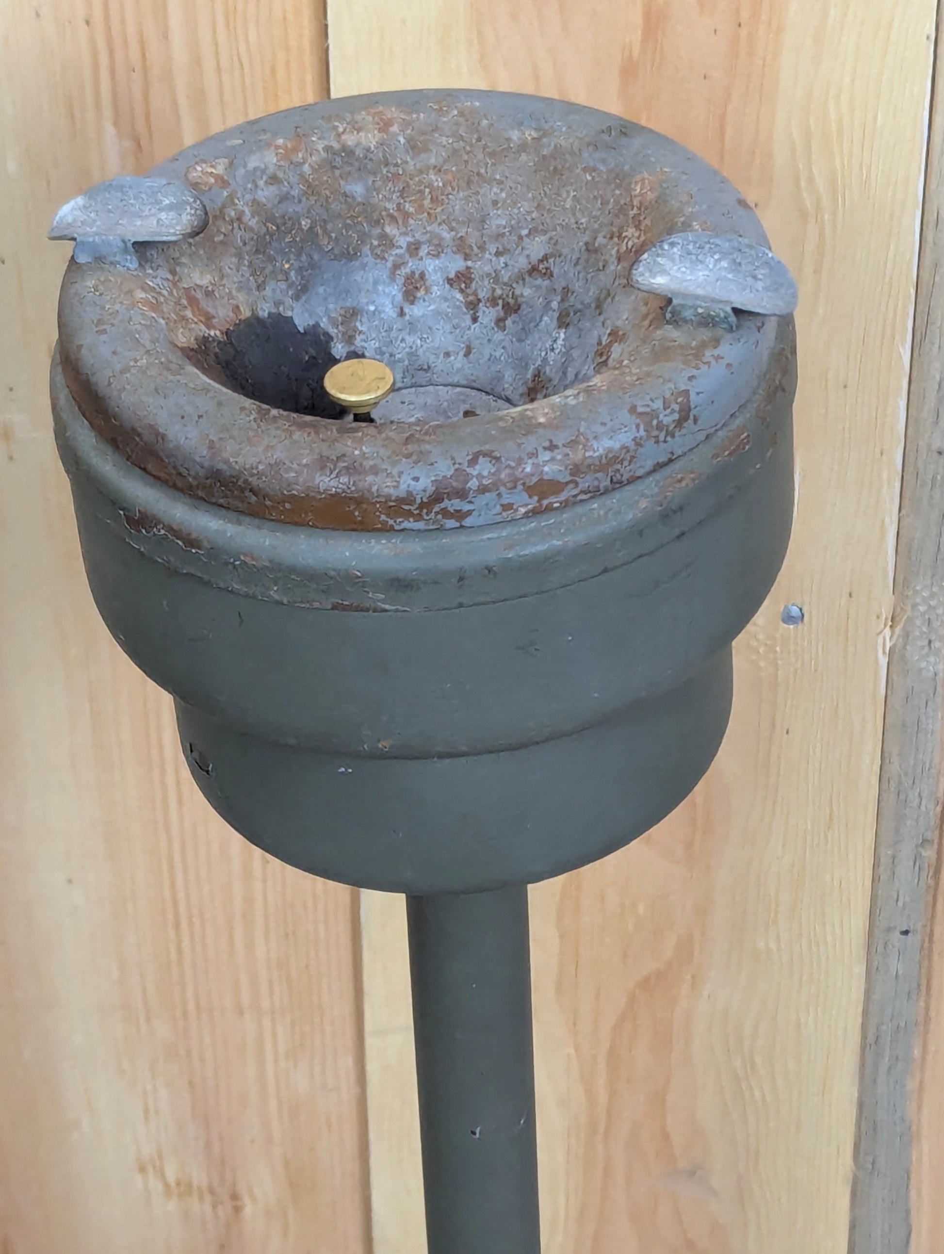 This vintage metal ashtray stand stands 21” high and showcases charming signs of wear that add to its authentic character. Perfect for adding a nostalgic touch to any space, it combines sturdy metal construction with classic design, making it both a practical and stylish accessory for smokers or collectors alike. Its height and stable base ensure convenience and functionality while preserving a timeless vintage appeal.