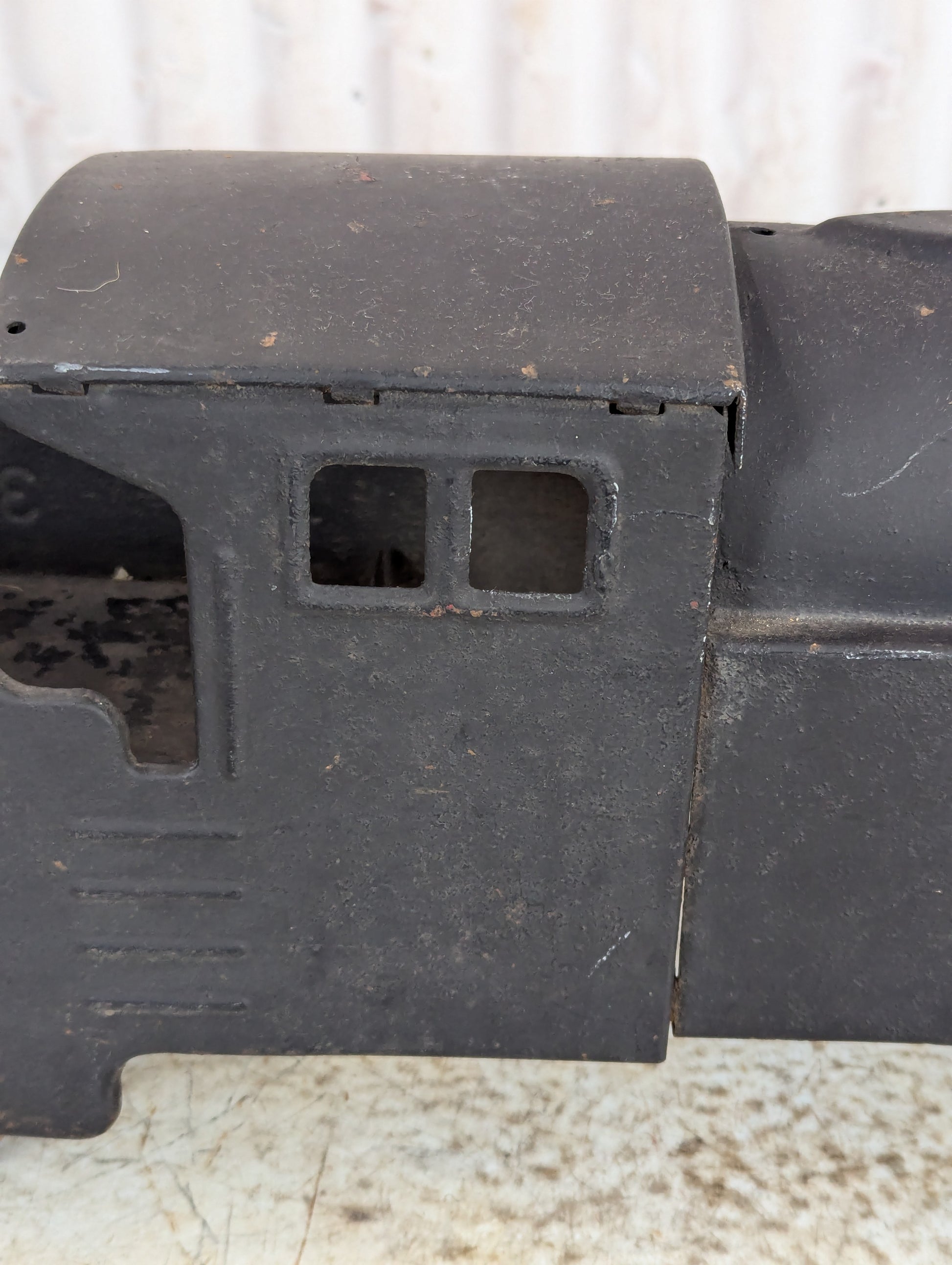 This vintage metal No. 3000 train from Marx Toys is a charming collectible measuring 22” x 7” with a height of 10”. While it is in fairly good condition, please note it is missing one wheel. Its sturdy metal construction and classic design make it a unique addition to any collection or display. Don’t miss the chance to own this nostalgic piece of history.