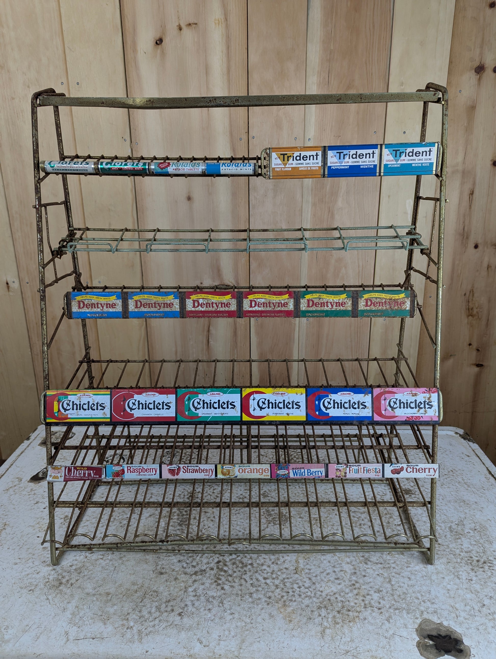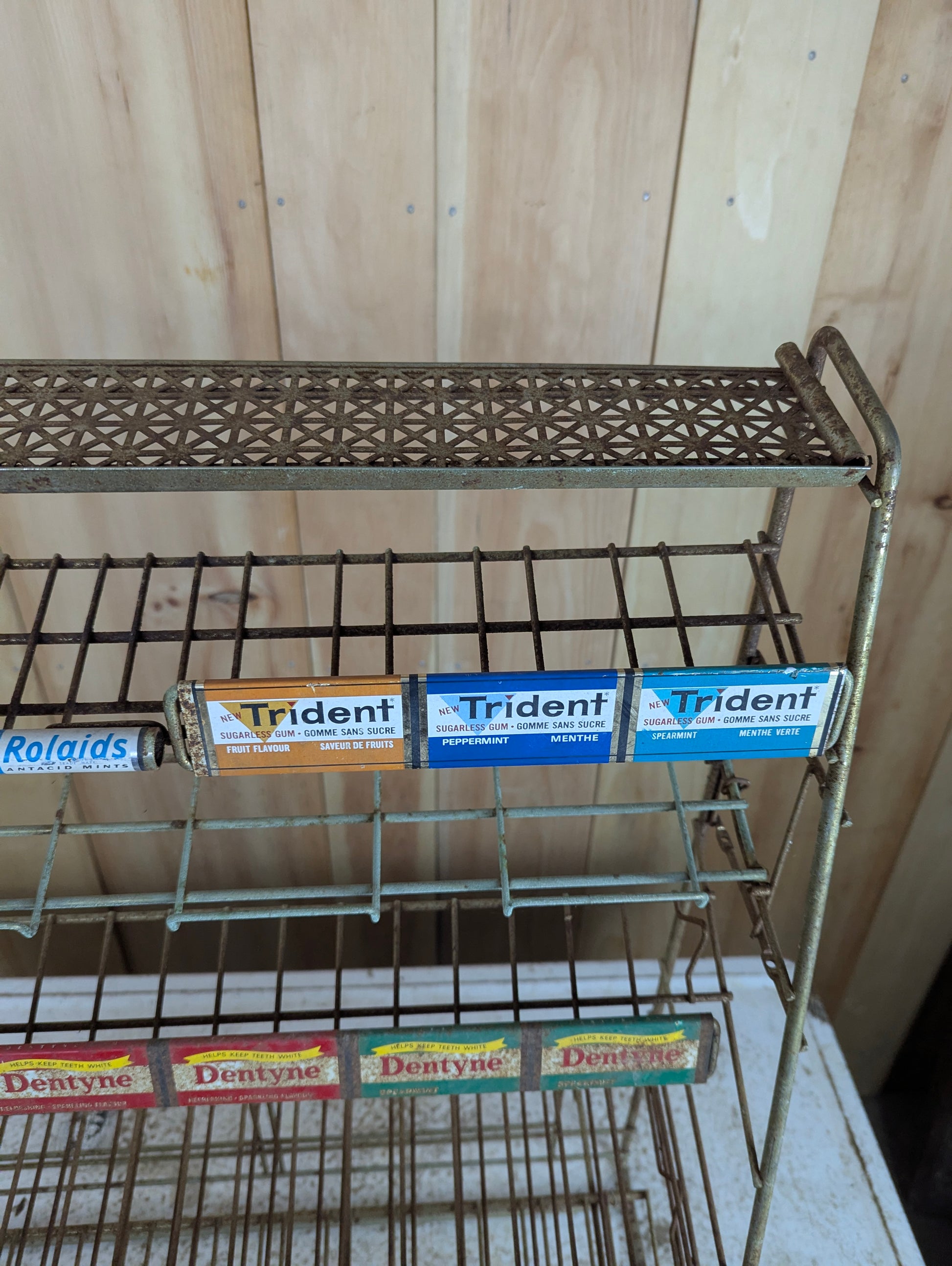 This vintage metal retail gum and mints display rack is a collectible piece featuring authentic logos from Chiclets, Rolaid’s, Dentyne, Trident, Clorets, and other Adams Gums. Measuring 28.5” high, 24” wide, and 9.5” deep, it includes six sturdy display racks and is portable for easy placement. While showing signs of wear, it remains in its original condition, offering both nostalgia and practical use for collectors or retailers seeking a unique, branded display solution.