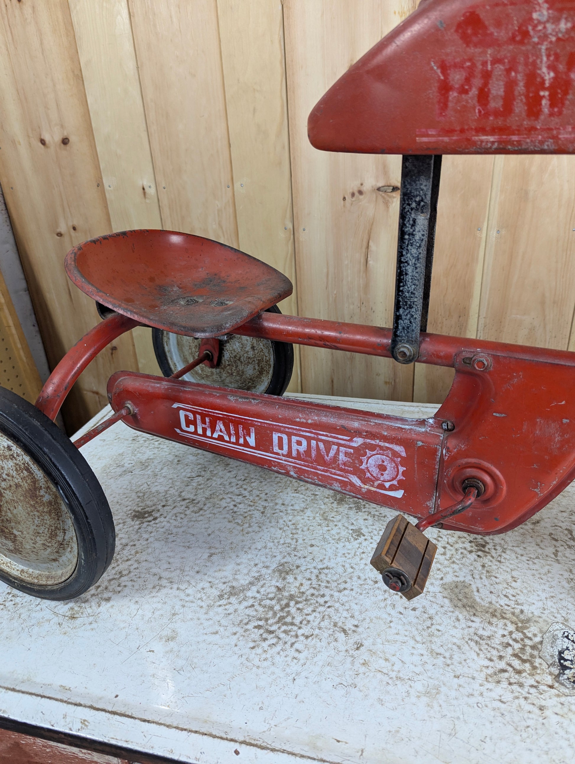This Vintage Power Trac Pedal Car Tractor is a charming collectible in fairly good condition, featuring its original paint and fully functional chain drive. Crafted from durable metal, its wheels turn smoothly, making it both a nostalgic display piece and a working pedal car. Perfect for collectors or those seeking a unique vintage toy with authentic character. Comes with attachable wagon.