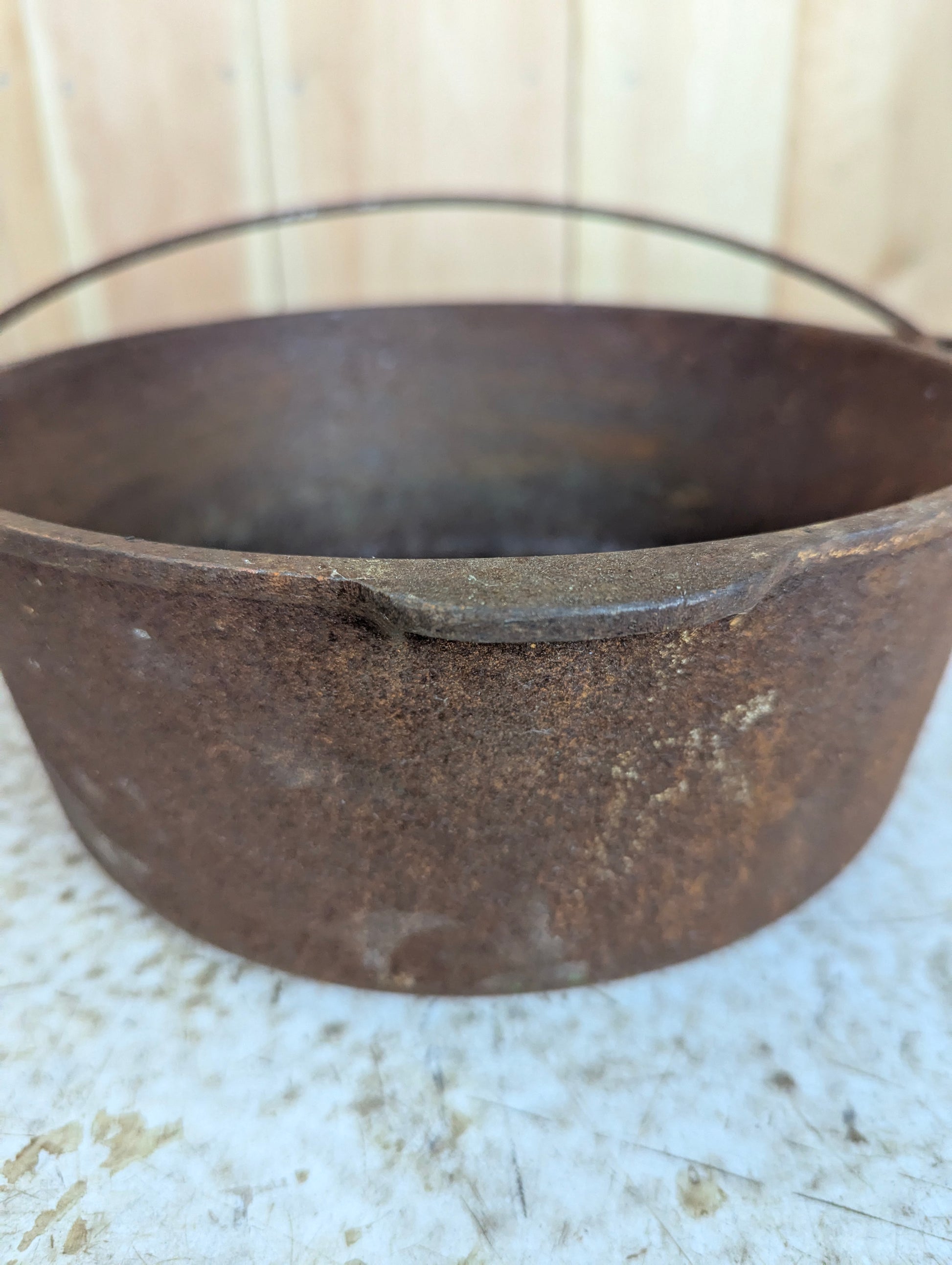 This Vintage Wagner Cast Iron Pot, measuring 10” in diameter and 4” high, combines rustic charm with sturdy craftsmanship. Though showing a naturally aged, rusted exterior, it remains free of holes, ensuring durability. Its heavy build and convenient carrying handle make it ideal for both indoor and outdoor use, perfect for adding authentic character to your cooking or decor. Embrace the timeless appeal and practical strength of this classic cast iron pot.