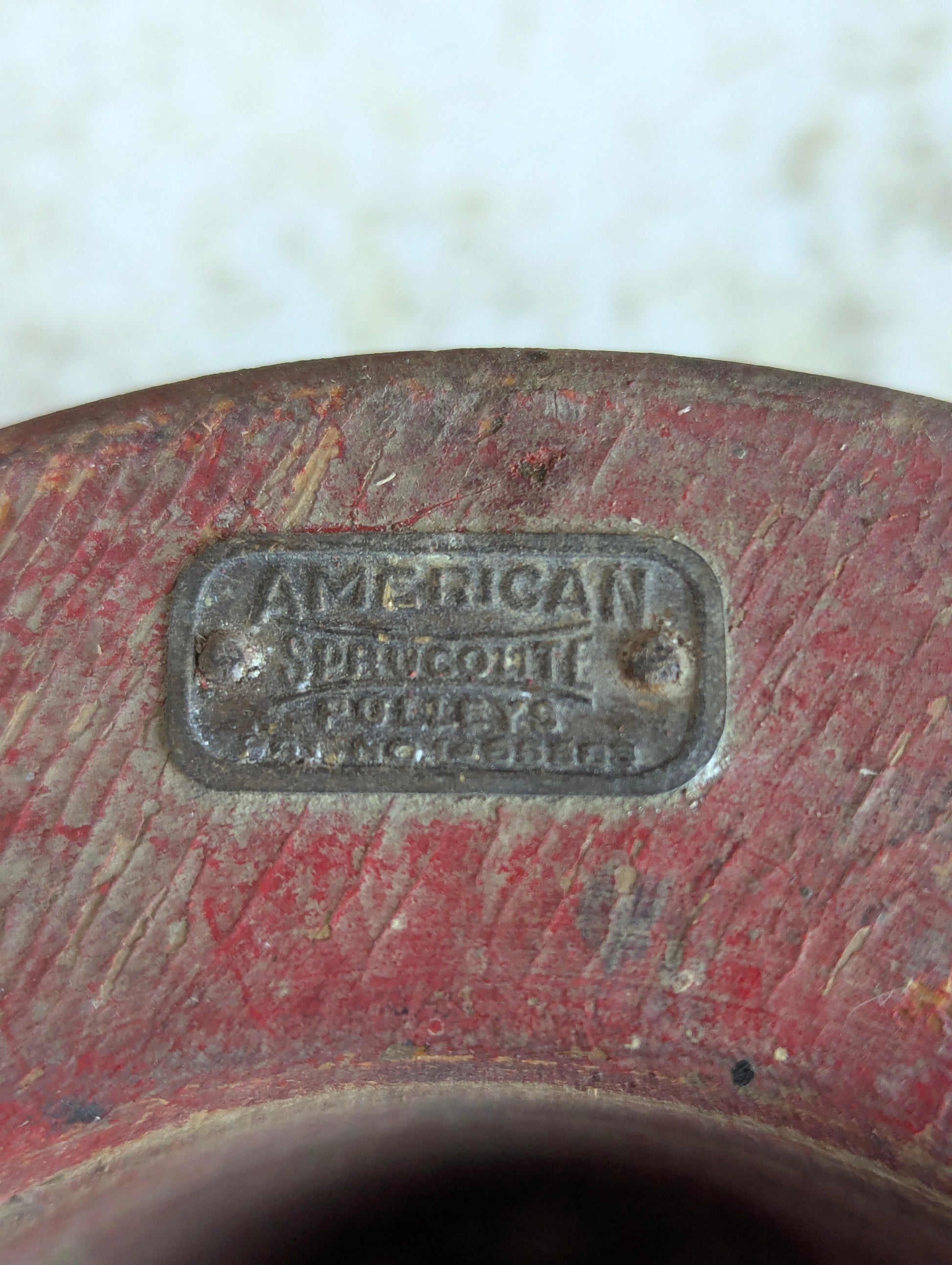 This vintage wooden belt pulley wheel, crafted by the American Sprucolite Co., offers authentic charm and sturdy craftsmanship. Measuring 7 inches in diameter and width, it likely originated from an old motor, making it a unique piece for restoration projects or rustic decor. Its good used condition highlights genuine wear that adds character while maintaining durability. Perfect for collectors or industrial-inspired interiors, this pulley wheel combines history and function in a timeless design.