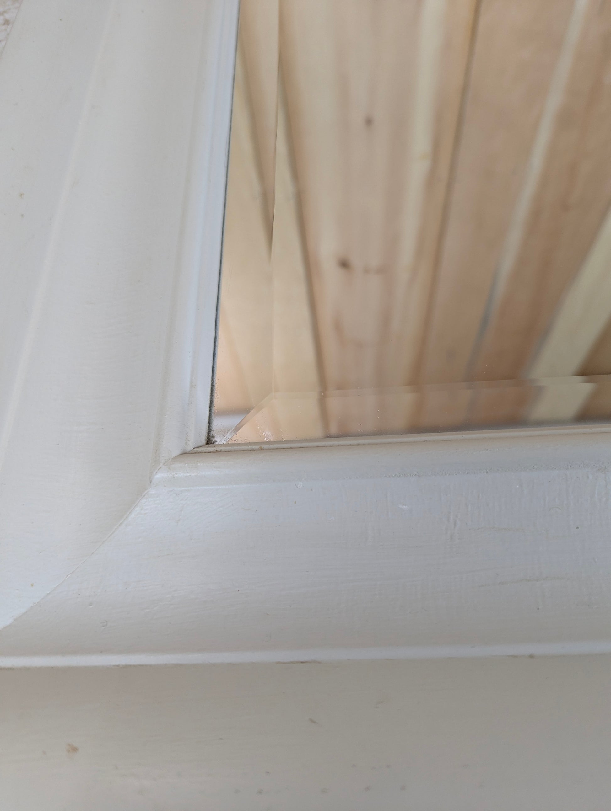 This wooden framed bevelled mirror, painted in a white finish, adds a touch of classic charm to any room. Measuring 36” x 30”, it is in excellent condition with no chips or cracks, ensuring a flawless reflection. Its sturdy frame and timeless design make it a perfect accent piece to enhance your home décor while providing practical use.